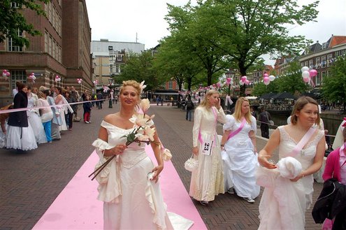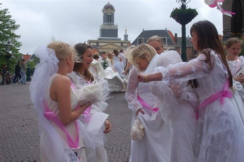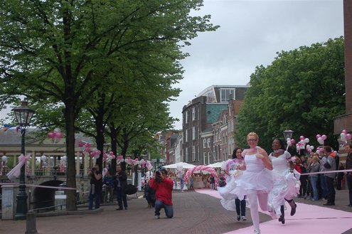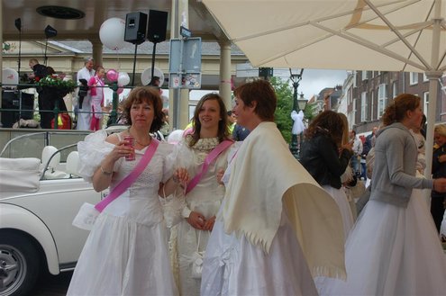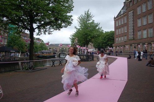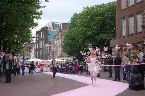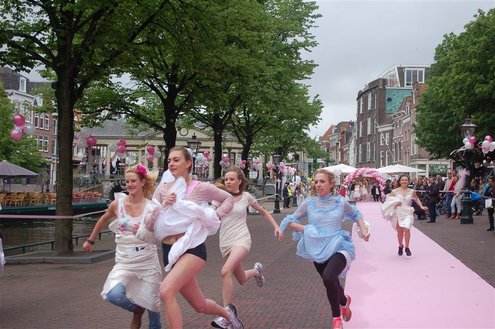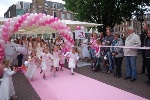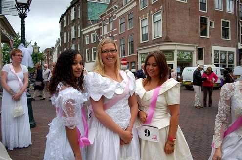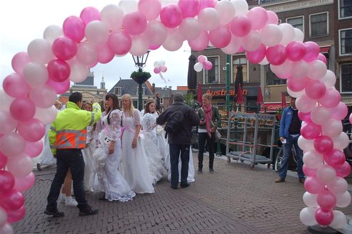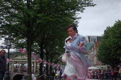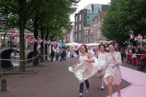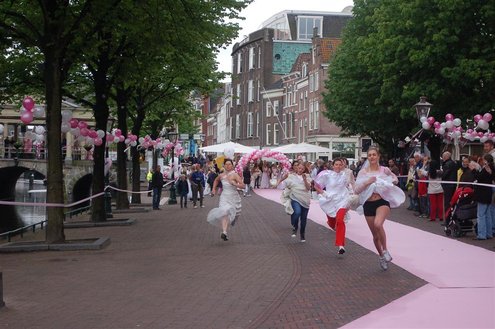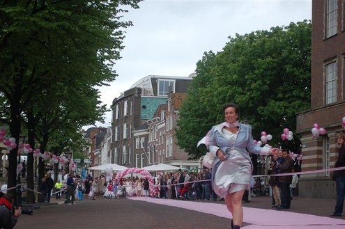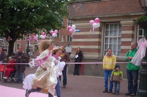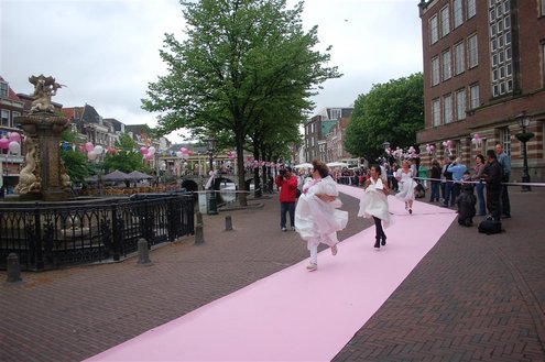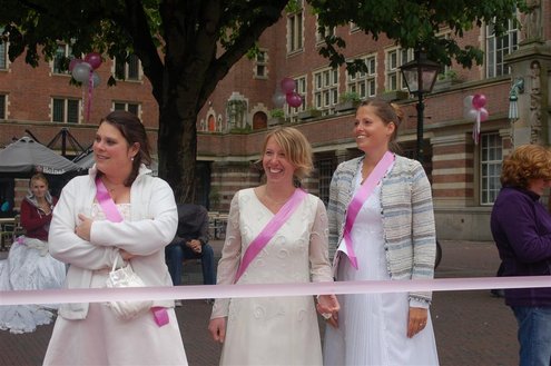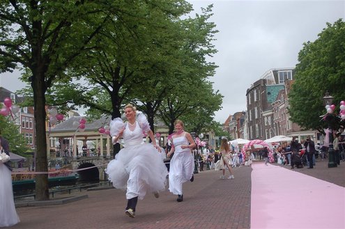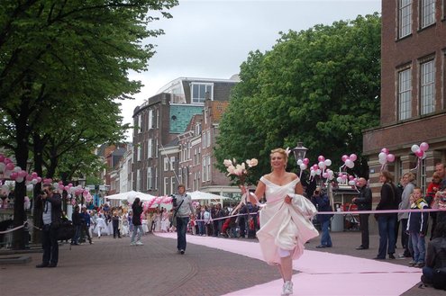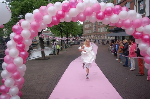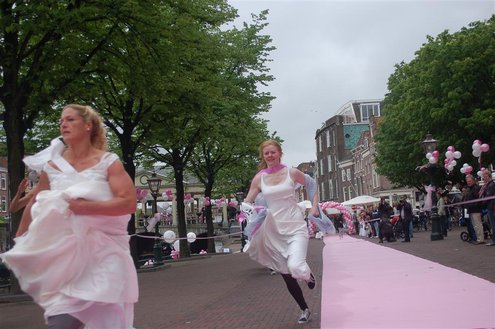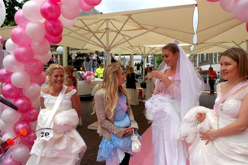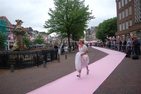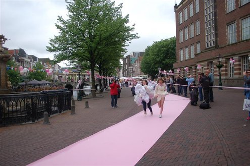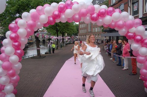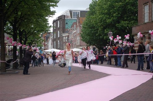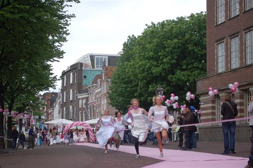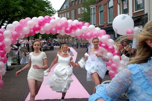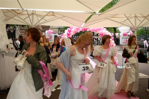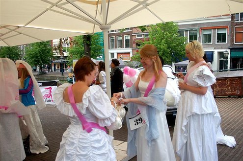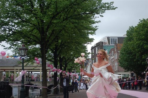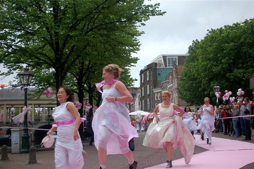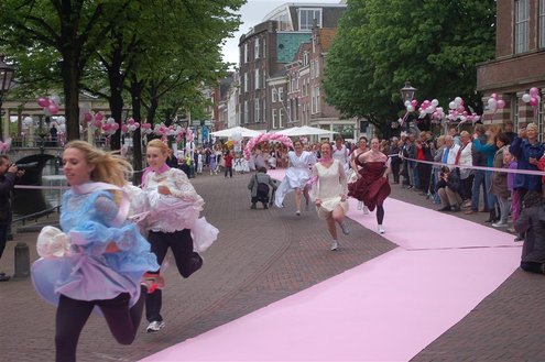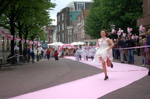 Vanmiddag vond voor de tweede maal de ‘Flair Running Bride’ plaats op het Stadhuisplein. Bruiden in hun mooiste jurken renden de benen uit het lijf om één van de aantrekkelijke prijzen in de wacht te slepen, zoals een volledig verzorgde huwelijksreis naar de zon, een Gucci-sieradenset en een trouwjurk naar keuze. Dit laatste lijkt wat vreemd, tenzij er gesprint werd in een geleend exemplaar. De meeste bruiden hadden de traditionele hoge hakken verruild voor een paar sportschoenen. De snelste bruid was Rianne Klein Brinke. Alle deelneemsters ontvingen een rijkelijk gevulde ‘goodiebag’ en na afloop stonden de champagne en natuurlijk een heuse bruidstaart klaar. Emile van Aelst was erbij en maakte een fotoverslag.