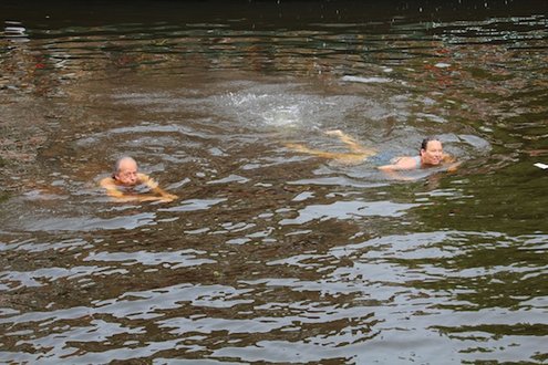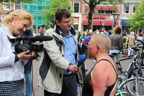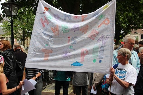 Badkleding, een ingestudeerd lied en zwemmen in de grachten van Leiden. Alle ingrediënten om de demonstratie tegen de sluiting van zwembad de Vliet een succes te maken waren aanwezig. De demonstratie op het Stadhuisplein trok dan ook veel bekijks bij omstanders en de pers. Diverse politici liepen gniffelend voorbij maar alleen CDA Leiden bleef hangen en steunde de demonstranten. Biek Teeuwissen – woordvoerder van ‘Red de Vliet’ – stond voorop en brulde diverse kreten door haar megafoon. Tevens meldde zij dat er al ruim 4000 handtekeningen zijn opgehaald om het zwembad tegen sluiting te behoeden.