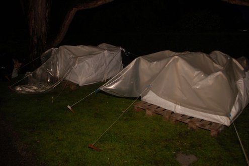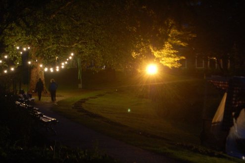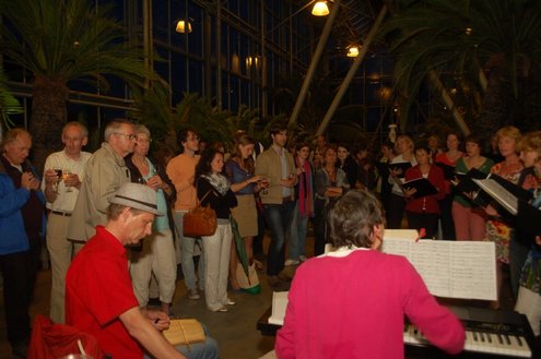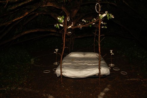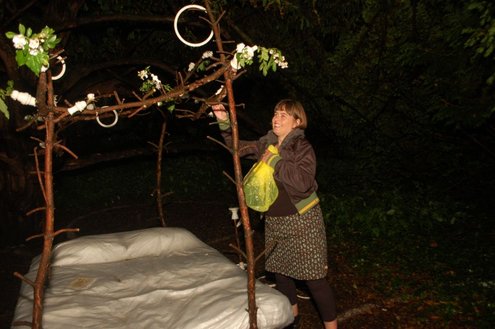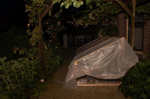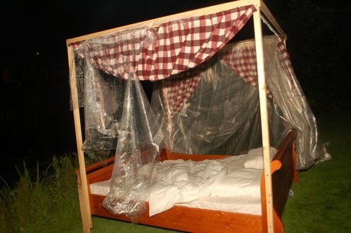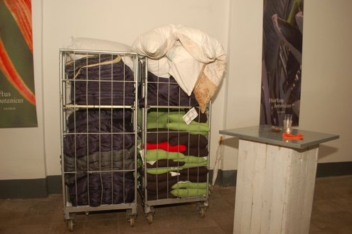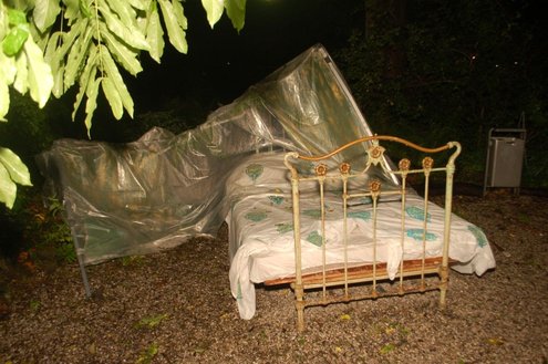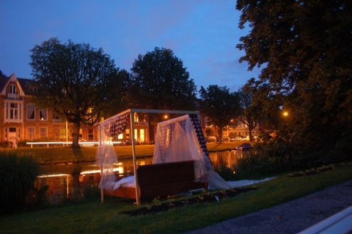 Gisteravond vond het grote Midzomernachtfeest plaats in de Leidse Hortus. Hoewel de Sleutelstad niet zo zwaar getroffen werd door het voorspelde noodweer, vielen de buitenactiviteiten grotendeels in het water. Ook de kunstzinnige openlucht hotelbedden, die in de tuinen stonden opgesteld, zagen er niet zo aantrekkelijk meer uit. Toch logeerden een aantal gasten na afloop van de optredens die binnen werden gehouden, in de buitenlucht. Jong K&G trakteerde de bezoekers, die toch in redelijke getalen gekomen waren, op vrolijke muziek en wethouder Jan-Jaap de Haan verrichte de officiële opening. (Foto’s: Emile van Aelst.)