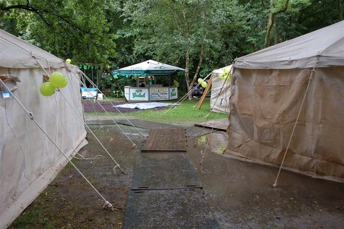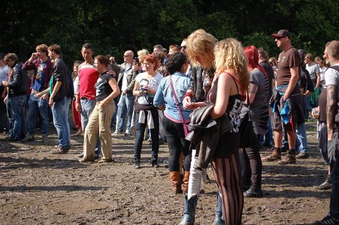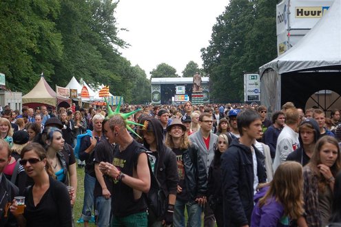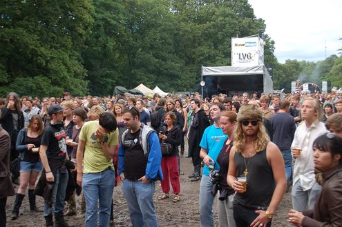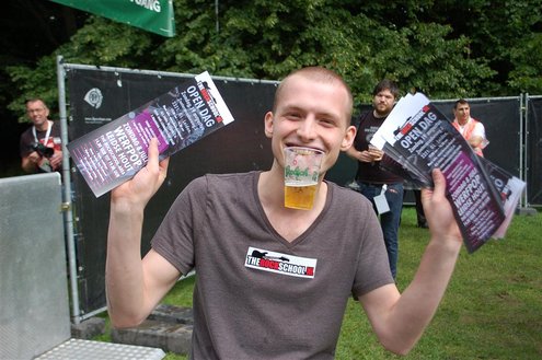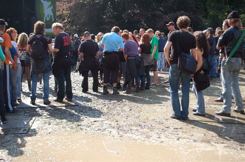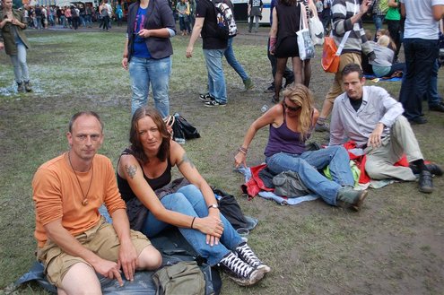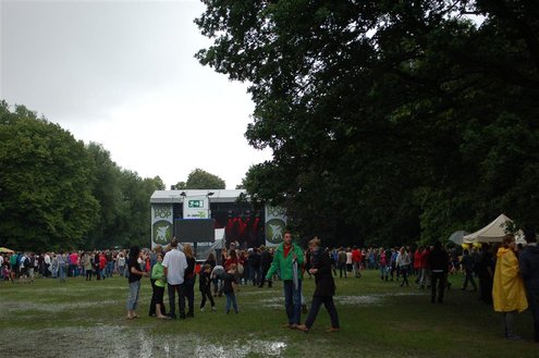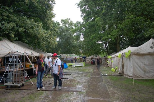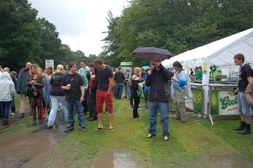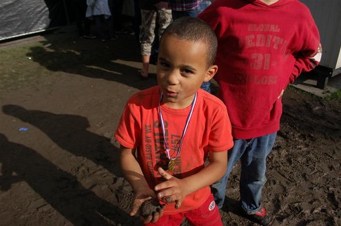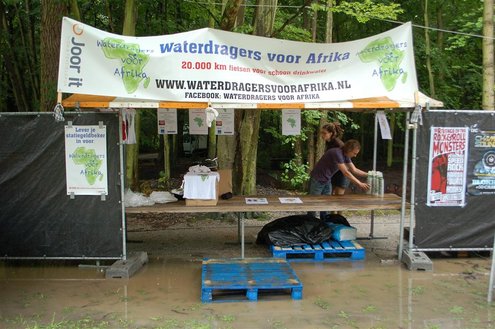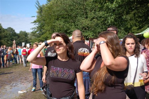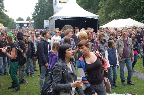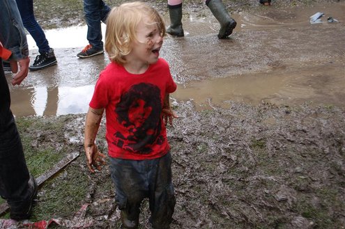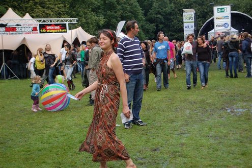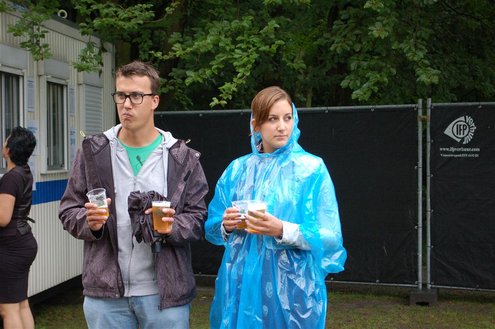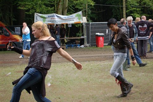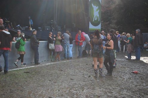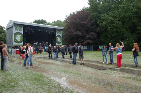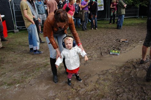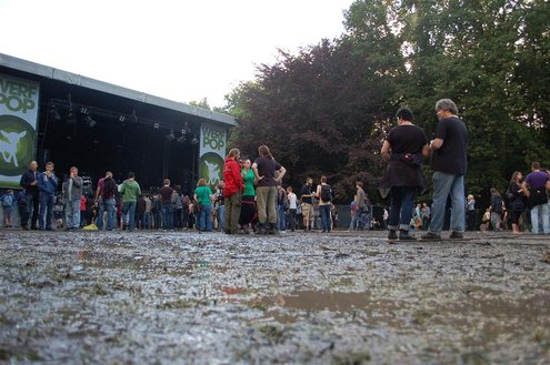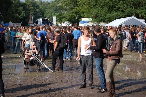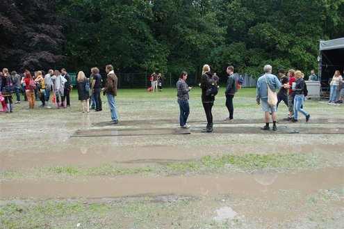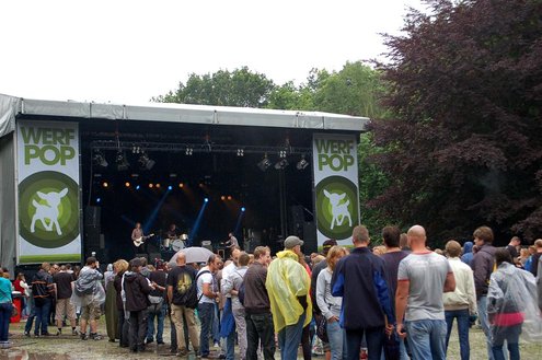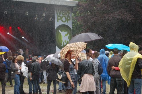 De rubberlaarzen, regenponcho’s, dekzeilen en vuilniszakken waren wel nodig bij de start van Werfpop 2012 in de Leidse Hout. Na een heuse wolkbreuk klaarde het weer iets na 14.00 uur op en kwam de zon zelfs tevoorschijn. Helemaal droog bleef het niet, maar dat mocht de pret niet drukken. Na de wat aarzelende start werd het steeds drukker en genoten de toeschouwers onder andere van ‘The Apollo Project’ en ‘Long Conversations’. Er werd flink geswingd en mee gestampt in de gigantische modderpoel voor de verschillende podia. Deze 31e editie van Werfpop werd afgesloten met een optreden van Sepultura, de vervanging voor Pennywise, die af moest zeggen om gezondheidsreden. Ook de kleine muziekliefhebbers genoten van de workshops, knutselen in de tent en vooral natuurlijk van de modder! (Foto’s: Emile van Aelst.)