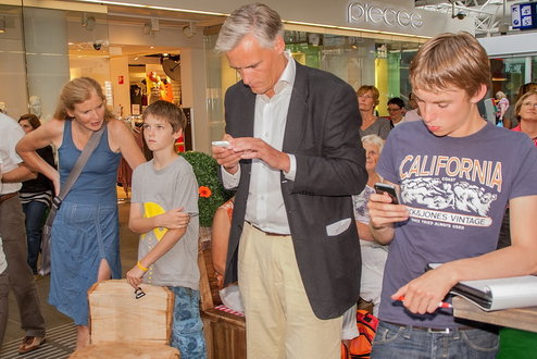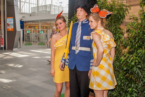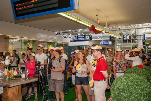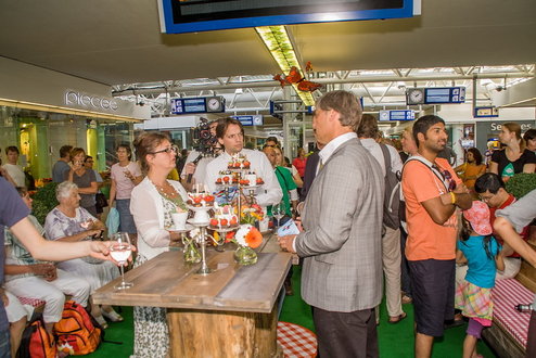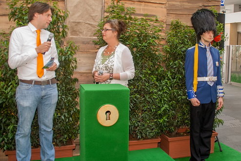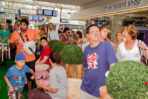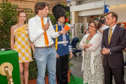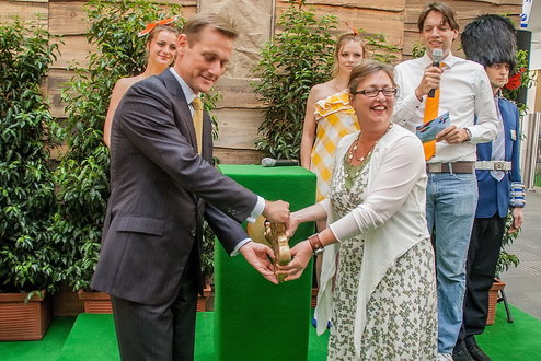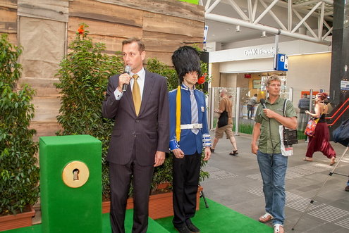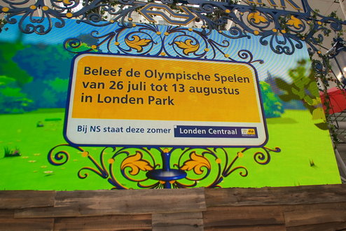 Afgelopen donderdag openden wethouder Roos van Gelderen en Michiel Noy, directeur NS Stations, ‘London Park’ op Leiden Centraal. Nadat ‘de sleutel was omgedraaid’ gaf Floris Jan Bovelander, winnaar van een gouden medaille bij het mannenhockey tijdens de Spelen van Atlanta, een mentale clinic. In het ‘park’ kunnen reizigers en bezoekers picknicken in het groene gras en de Olympische Spelen in Londen volgen op grote schermen. Ook op andere stations in het land staat Londen centraal. ( Foto’s: J.P.Kranenburg )