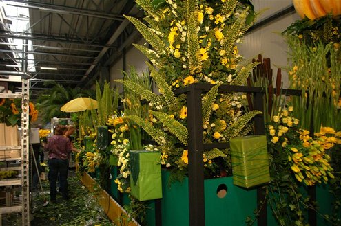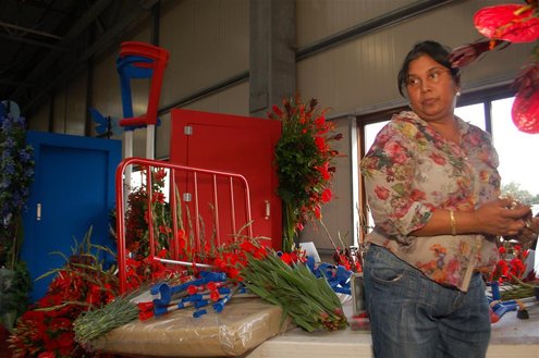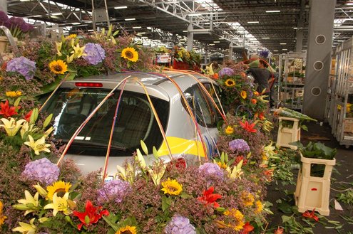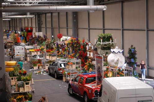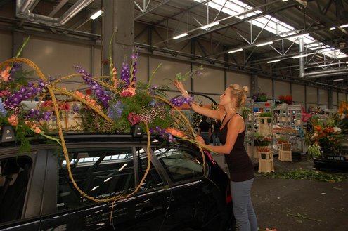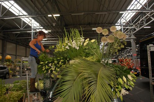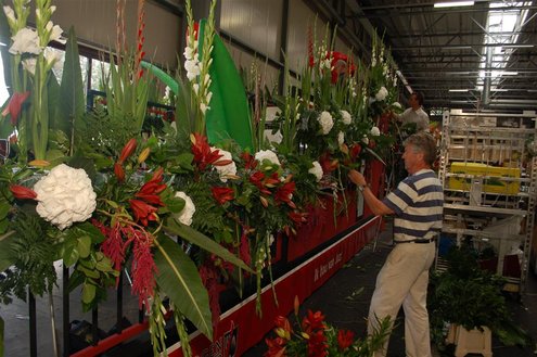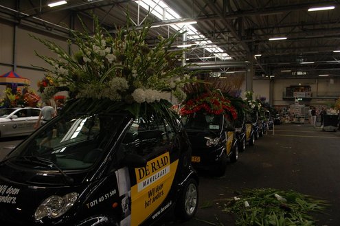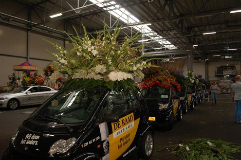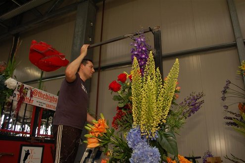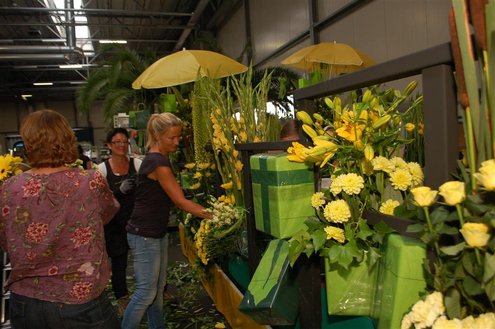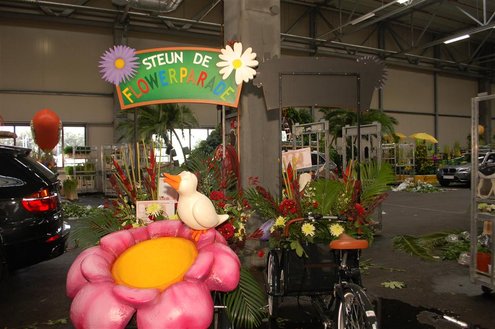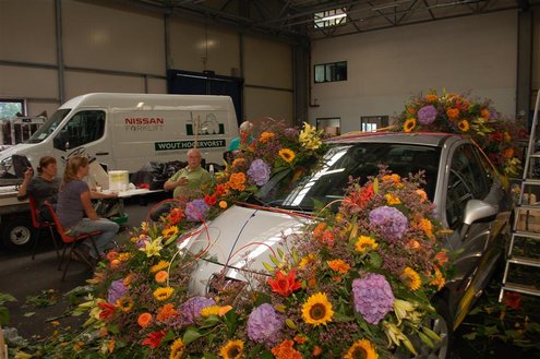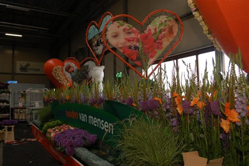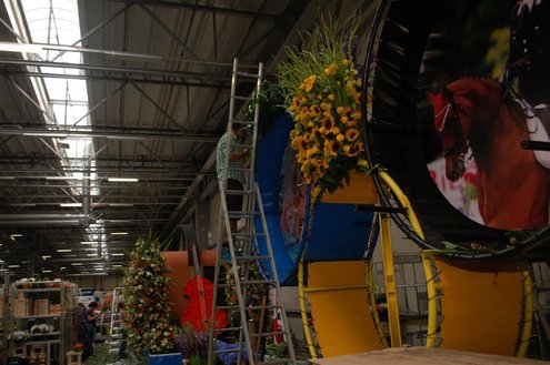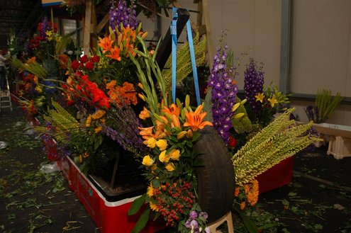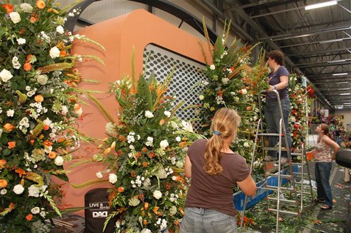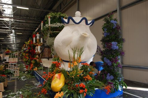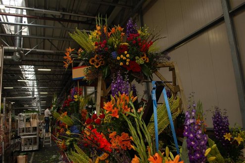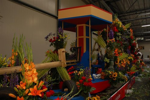 Gisteravond waren de praalwagens in de Bloemenveiling Flora in Rijnsburg te zien en vandaag reed de Flower Parade door de zonnige straten van Rijnsburg, Katwijk en Noordwijk aan Zee. Emile van Aelst was bij het voorbereidende werk, waarbij heel veel mensenhanden heel veel zomerbloemen rangschikten.