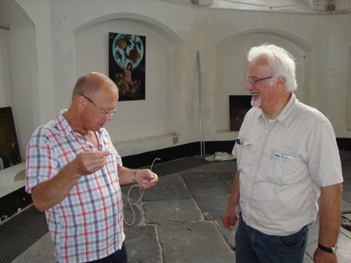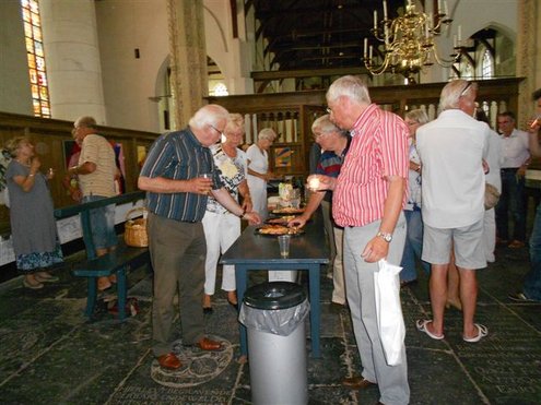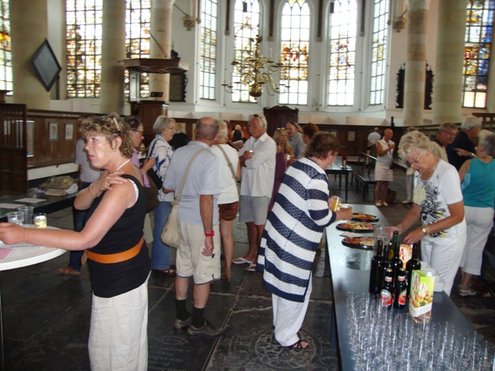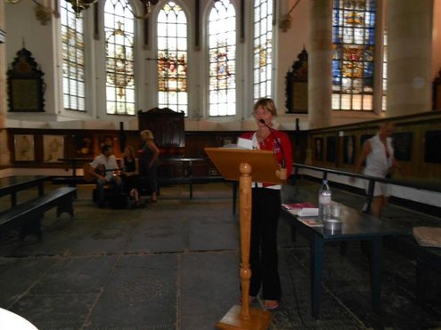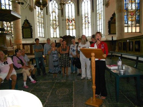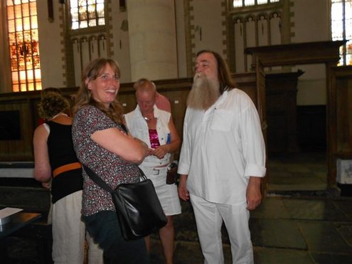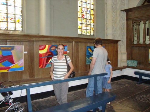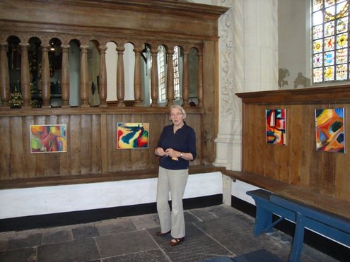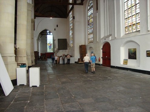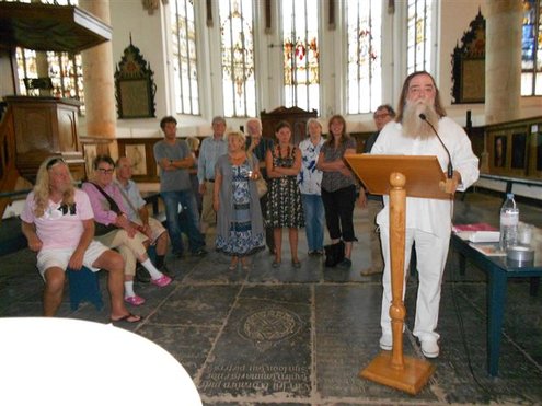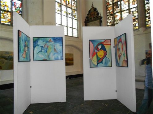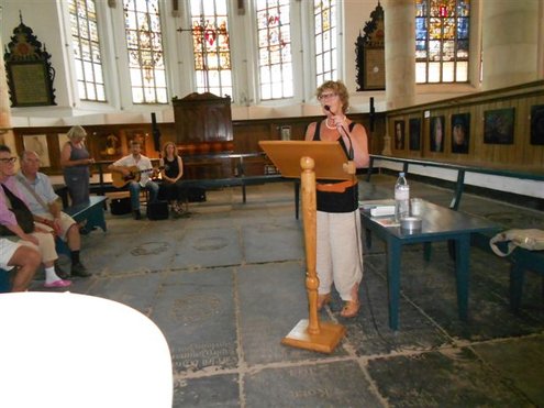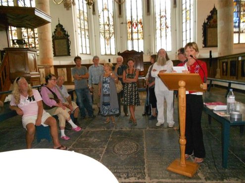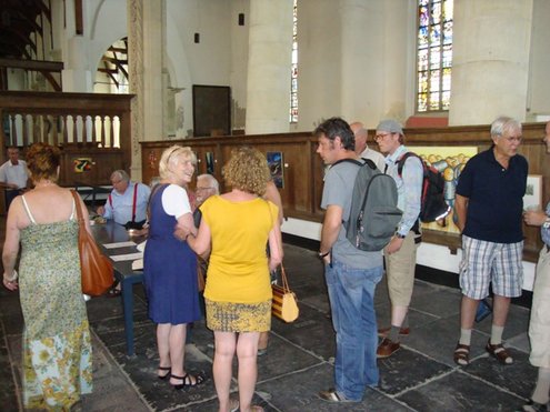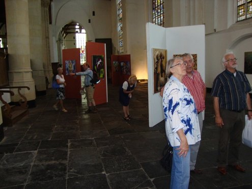 10 leden van de Leidsche Mondialen, een kunstenaarscollectief opgezet door Dick Bakhuizen van den Brink, exposeren hun werk in de Grote Kerk in Edam. De feestelijke opening vond afgelopen zondag plaats. De Leidse dichteres Pink Meltzer smolt poëtisch Edam en de Sleutelstad aan elkaar, nadat organisator Anita Kroon en Bakhuizen van den Brink een kort welkomstwoord hadden gesproken. Zo’n 100 bezoekers woonden de feestelijkheden bij in de koele kerk; buiten was het 35 graden. De tentoonstelling loopt tot en met 30 september en is dagelijks geopend tussen 13.30 en 17.00 uur. ( Foto’s: de Leidsche Mondialen.)