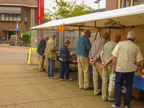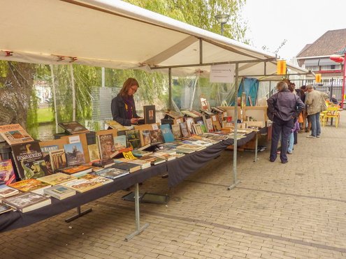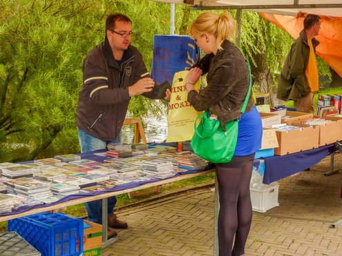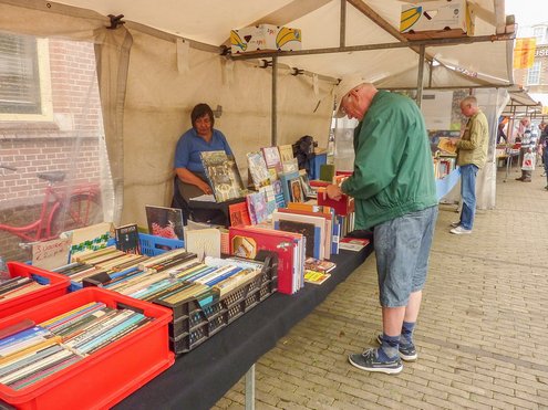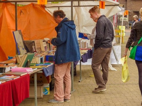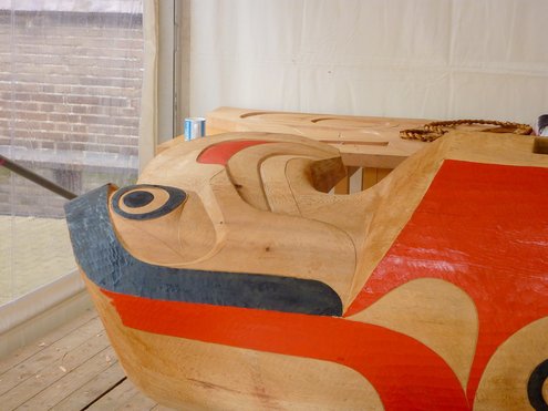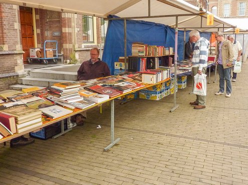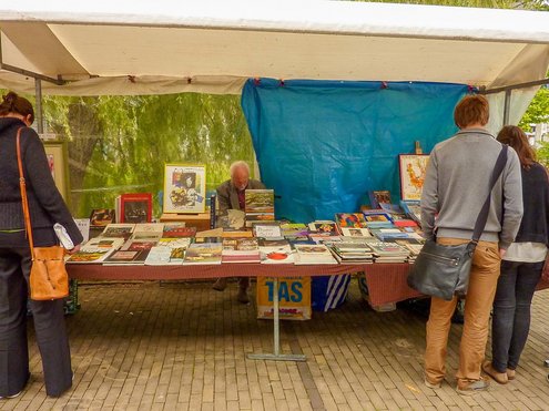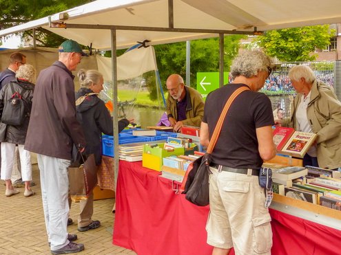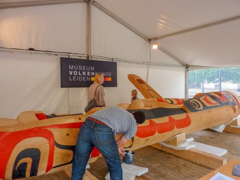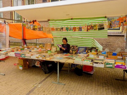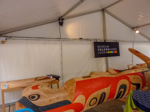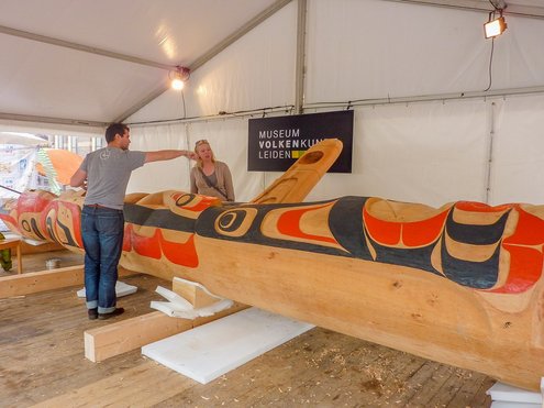 Afgelopen zaterdag werd voor de vierde keer de Leidse Boekenmarkt gehouden in de tuin van Museum Volkenkunde. De regen kwam vooral ’s middags met bakken naar beneden, maar in de ochtenduren werd de markt met het thema ‘Architectuur’ redelijk bezocht. Uit voorzorg onder een goed afdak, konden de bezoekers de totempaal bewonderen, waar de laatste hand aan wordt gelegd. Dit is het topstuk van de komende familietentoonstelling ‘Het verhaal van de totempaal’ die in oktober van start gaat. Het pronkstuk werd voorbereid in Canada door Indiaanse kunstenaars. (Foto’s: J.P.Kranenberg.)