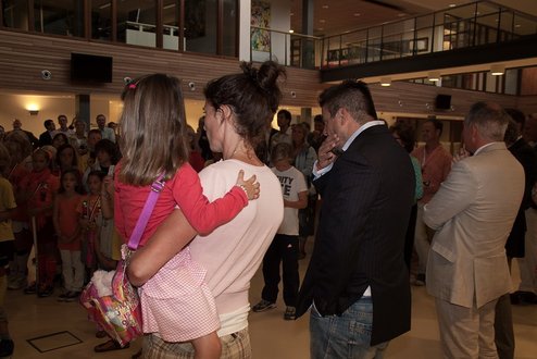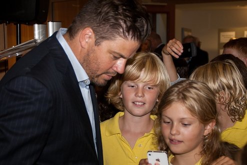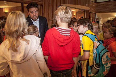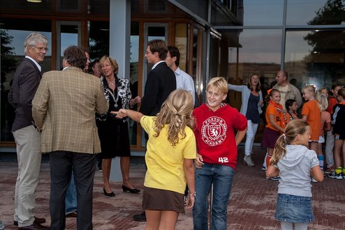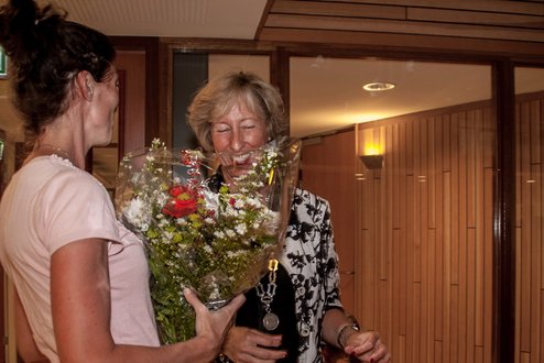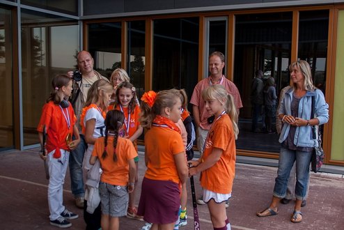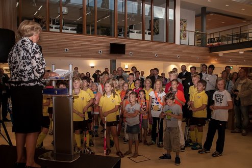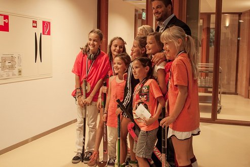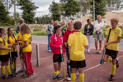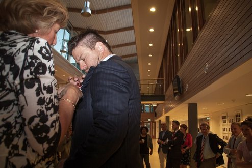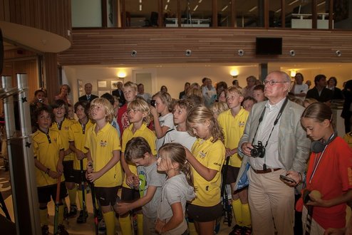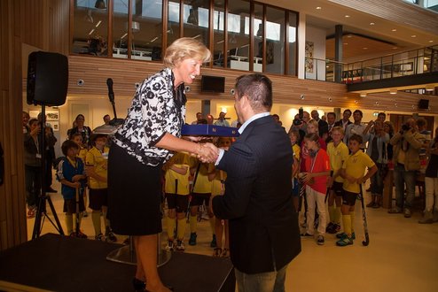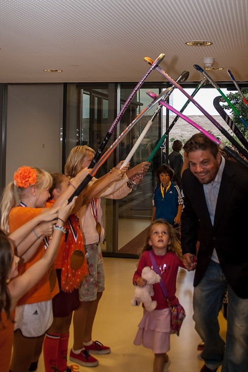 Gisteren werd hockeybondscoach Max Caldas gehuldigd in de ridderzaal van het Leiderdorpse gemeentehuis. Burgemeester Laila Driessen speldde de coach de zilveren speld op. De jonge hockeyspelertjes van Alecto maakten met hun sticks een ereboog voor hun held. Onderleiding van Caldas behaalde het Nederlandse damesteam goud op de Olympische Spelen in Londen en won van Argentinië. (Foto’s: J.P. Kranenburg.)