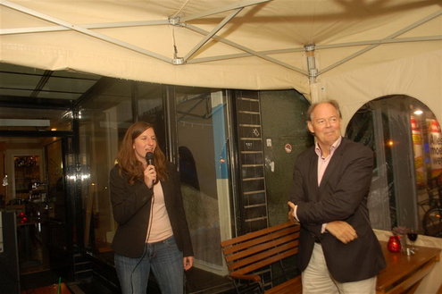 Bij zijn afscheid werd Paul van Meenen overrompeld met het erelidmaatschap van zijn partij. "ïk heb het niet snel, maar nu sta ik even met m'n mond vol tanden", aldus een zichtbaar geroerde Van Meenen. Naast hem zijn echtgenote Anke en D66-wethouder Frank de Wit. (Foto's: Emile van Aelst).