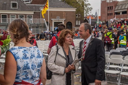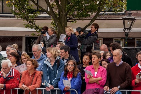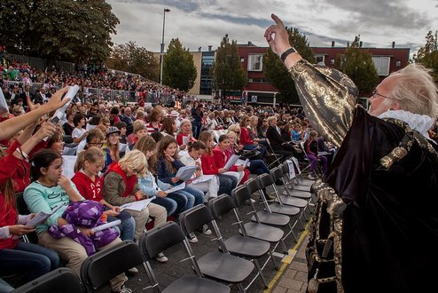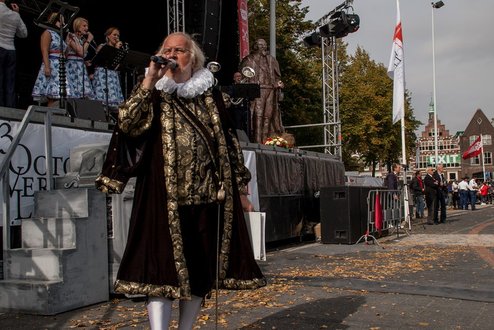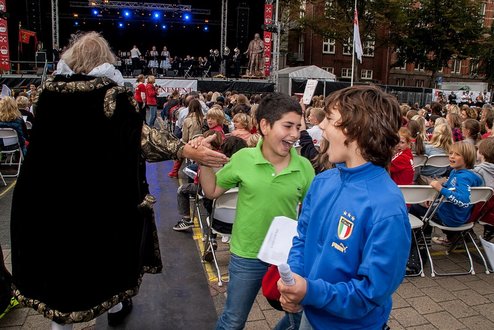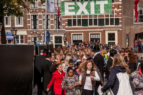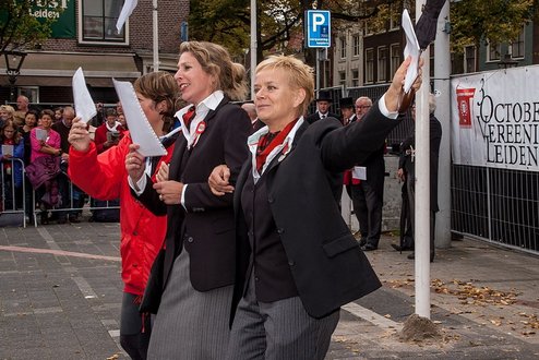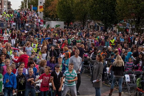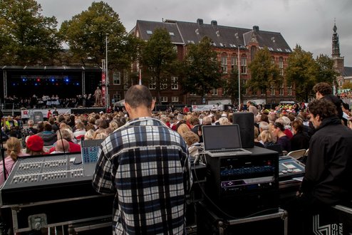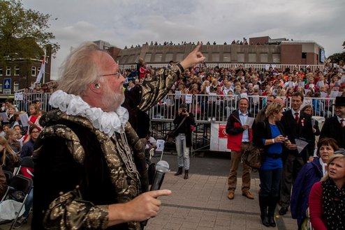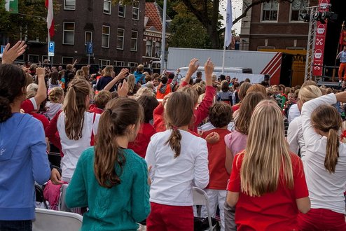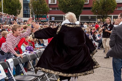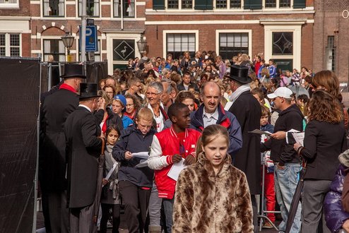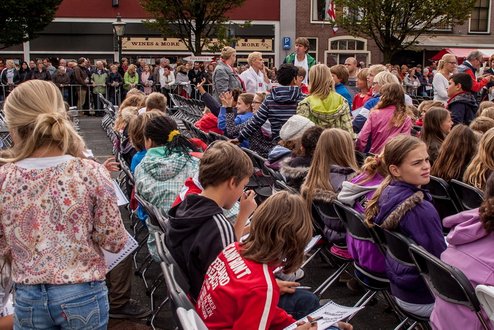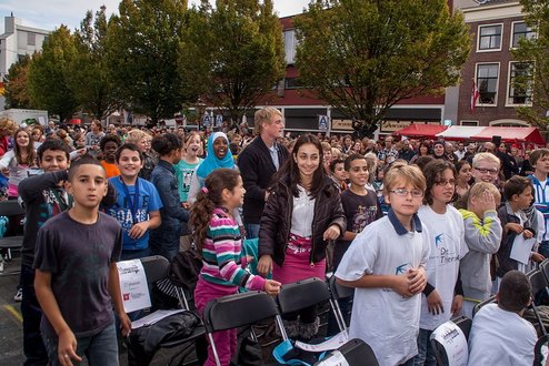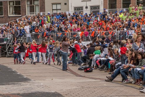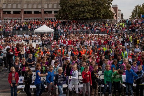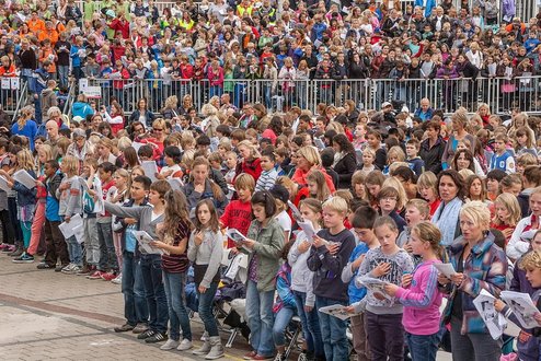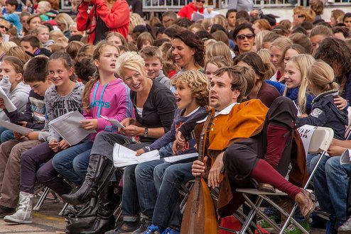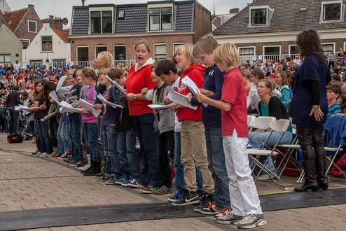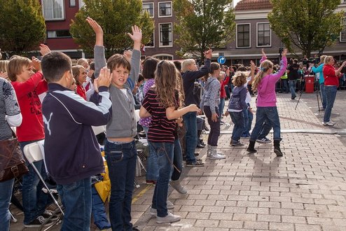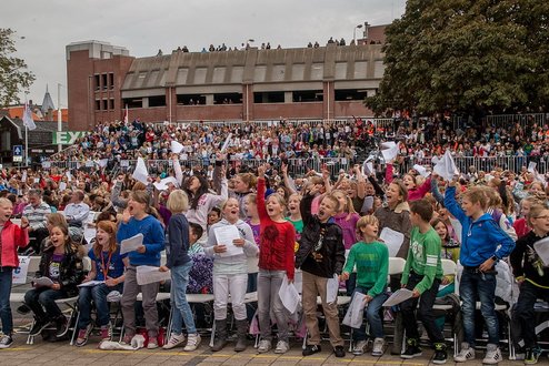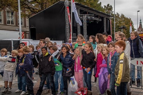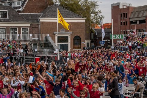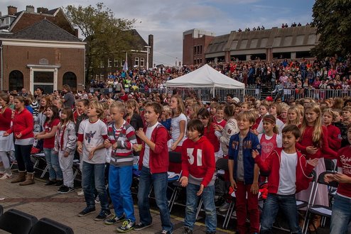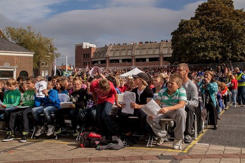 Vanmiddag rond 13.00 uur daalde burgemeester Van der Werf postuum van zijn sokkel en haalde het doek op voor een schitterend liedjesfestijn: het minikoraal! Uit 3300 kinderkelen klonken de vaderlandse liederen en natuurlijk ook het Leidse Volkslied “Leiden mijn stad”. Niet iedereen kwam uit de Sleutelstad, want er waren ook basisschoolleerlingen uit Leiderdorp, Zoeterwoude, Oegstgeest en Voorschoten. Ook de huidige Leidse burgervader, Lenferink en de (loco)burgemeesters van genoemde gemeentes waren aanwezig en zongen uit volle borst mee. Het minikoraal werd vandaag voor de 20e keer gehouden. De pianist van weleer, Dhr. v.d. Kwartel, beklom voor deze gelegenheid nog éénmaal het podium. K&G3 verzorgde als altijd de muzikale begeleiding met de achtergrondzangeressen: de dames Lucas, Noyon en Filemon. (Foto’s: J.P.Kranenburg)