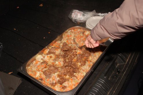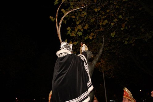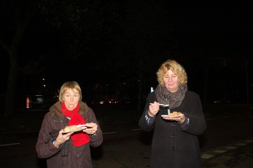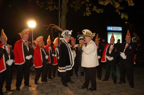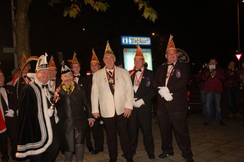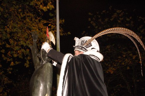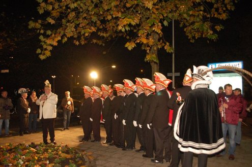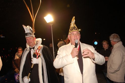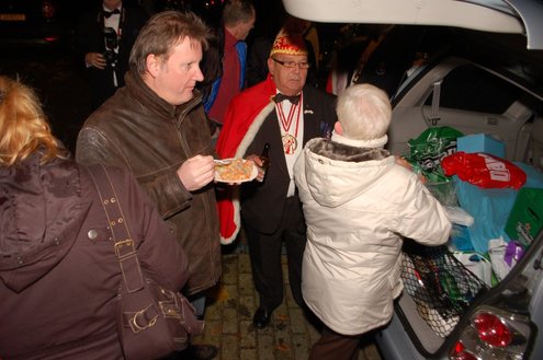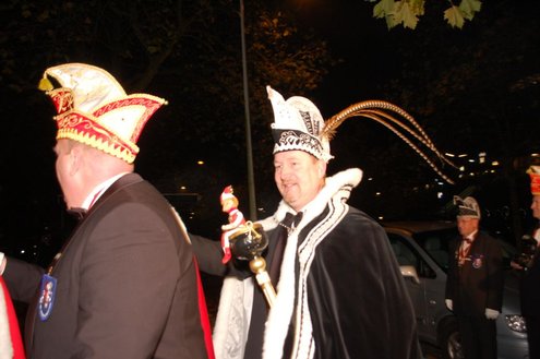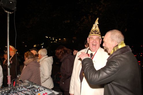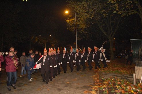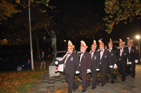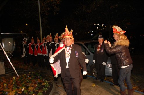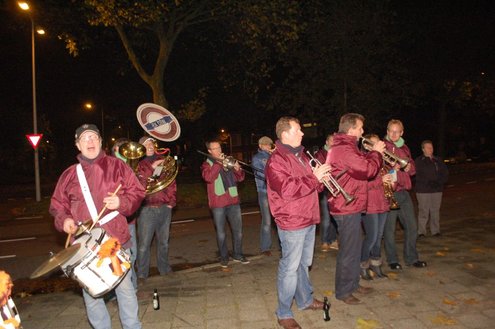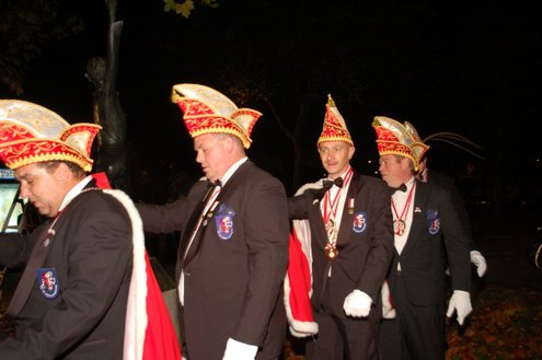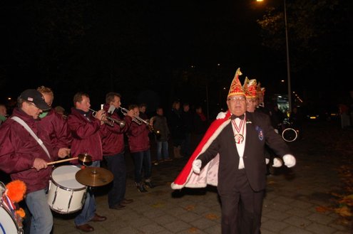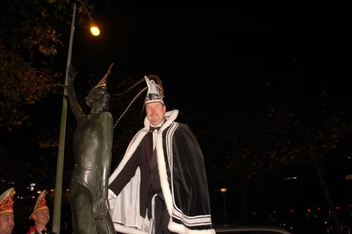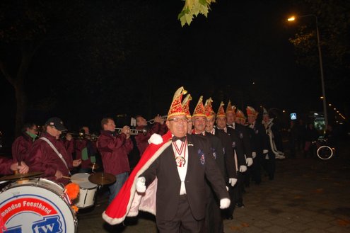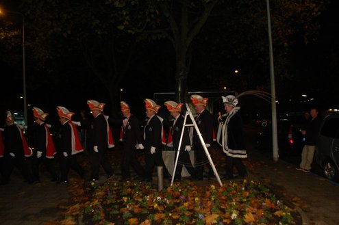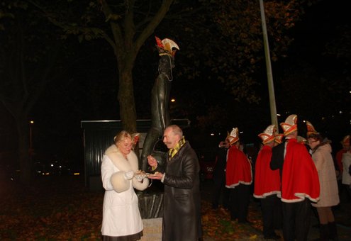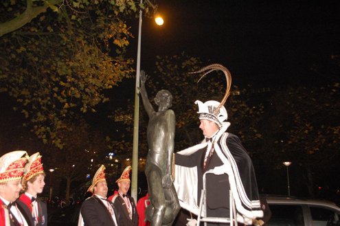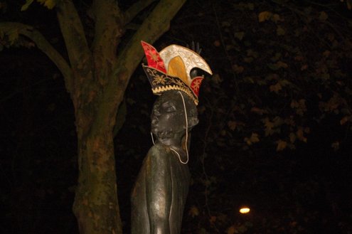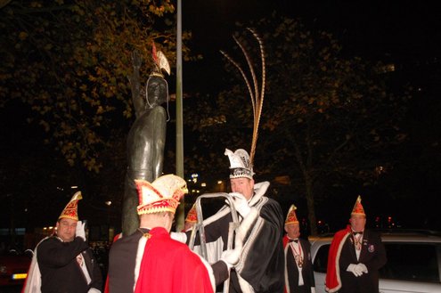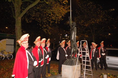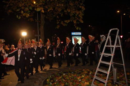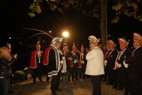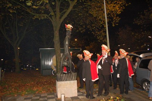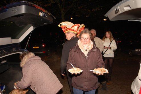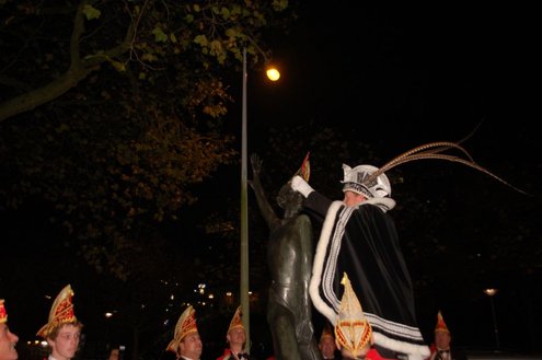 Gisteravond om exact 11 minuten over 11 (23.11 uur) kreeg het standbeeldje van Cornelis Joppensz weer de traditionele steek op het hoofd als aftrap van het jaarlijks carnavalsseizoen van de Leidse Hutspotten. De muzikale omlijsting was in handen van het Warmondse blaaskapel EX BTW en het Koetshuis zorgde voor de toepasselijke hutspotmaaltijd. (Foto’s: Emile van Aelst.)