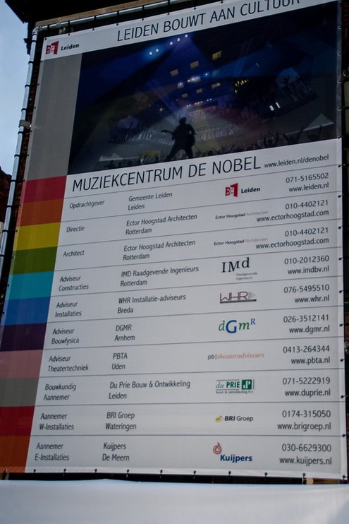 Vanmiddag is het officiële startsein gegeven voor de bouw van Muziekcentrum De Nobel in het Leidse cultuurkwartier. Tussen de Martksteeg en de Lange Scheistraat verrijst de komende anderhalf jaar een poptempel met twee zalen. Na de zomer van 2014 vormt De Nobel het nieuwe onderkomen van het LVC dat op de Breestraat plaats moet maken voor de Aalmarktplannen.