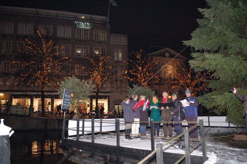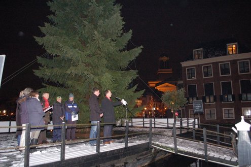 De binnenstad van Leiden is sinds vrijdagavond in kerstsfeer gehuld. Wethouder Pieter van Woensel en centrummanager Erwin Roodhart ontstaken samen de lichtjes van de kerstboom bij de Hoogstraat. De boom staat op een drijvend terras bij restaurant Annie’s.