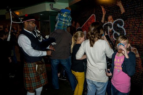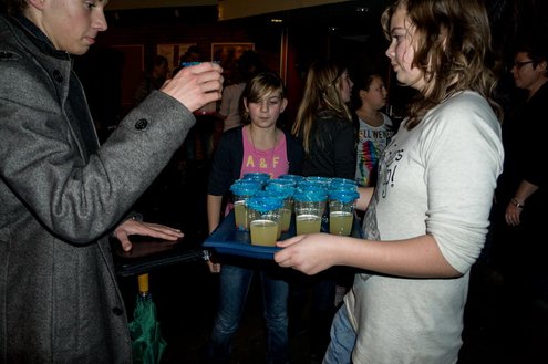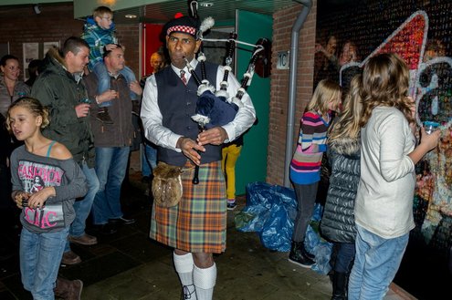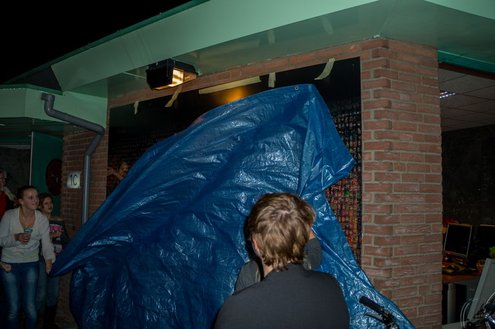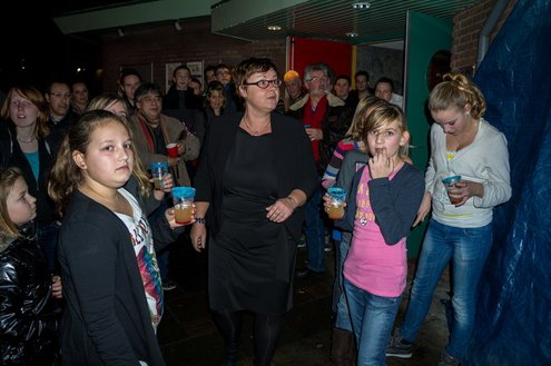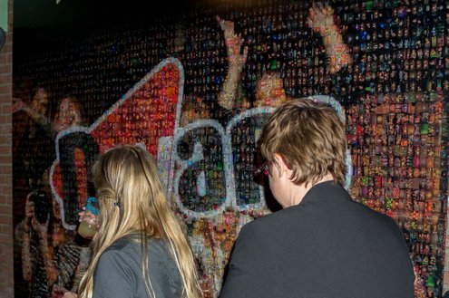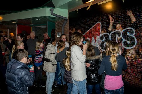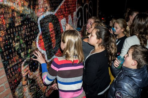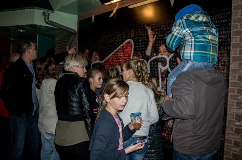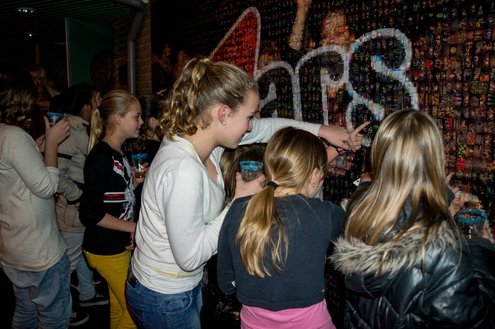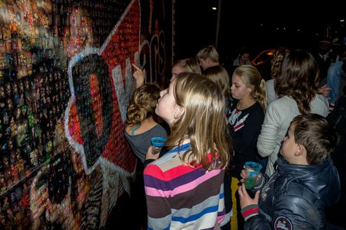 Meisjes van het jongerencentrum Dwars hebben gisterenavond hun Lomowand onthult. De wand is een mozaïk van allemaal kleine foto's waar uiteindelijk een grote afbeelding mee wordt gevormd. De meiden zijn de afgelopen maand bezig geweest met het kunstproject dat nu te zien is op de wand van jongerencentrum Dwars in Leiderdorp. (Foto: J.P. Kranenburg)