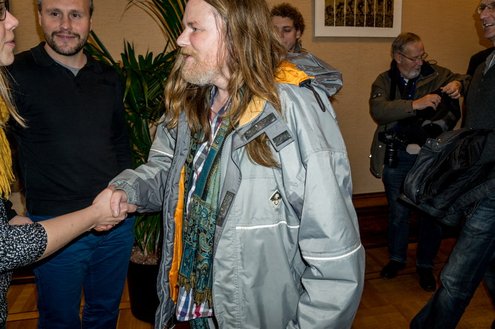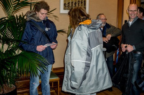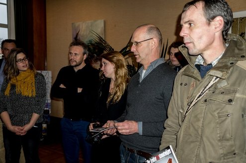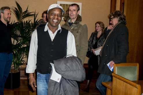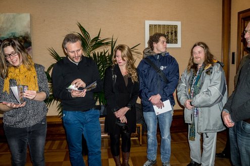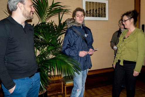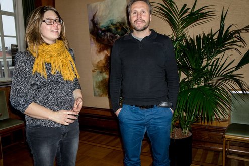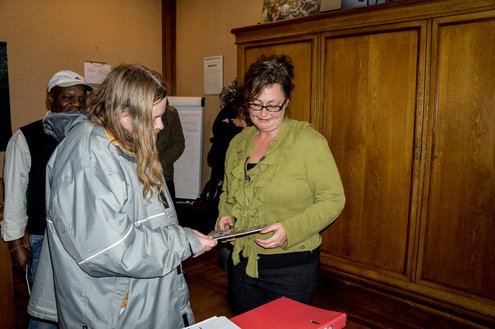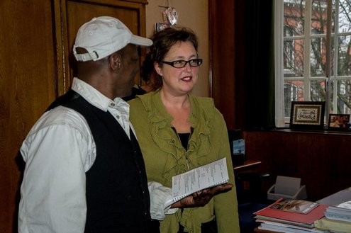 Edward overhandigt het eerste exemplaar van Leidse Straatwijzer aan wethouder Roos van Gelderen. (Foto: J.P. Kranenburg)