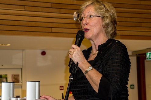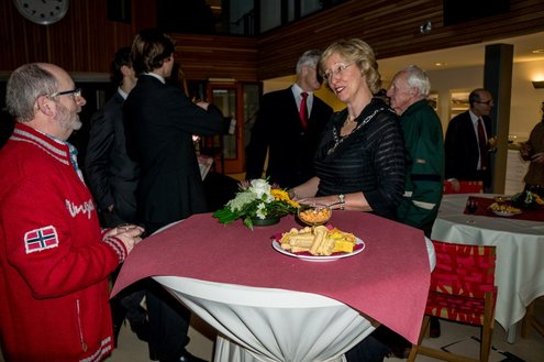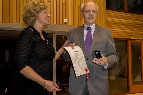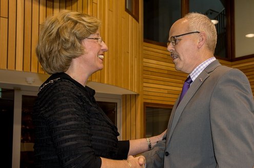 Joop van Huut neemt de Zilveren Speld in ontvangst van Laila Driessen, burgemeester van Leiderdorp (Foto: J.P. Kranenburg).
