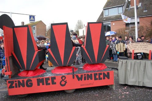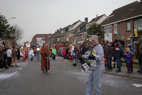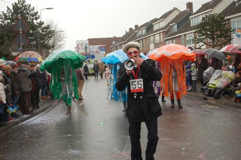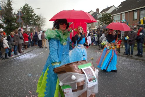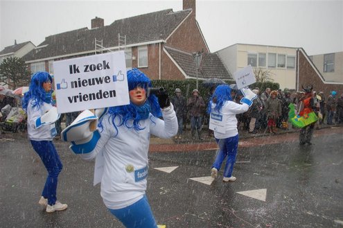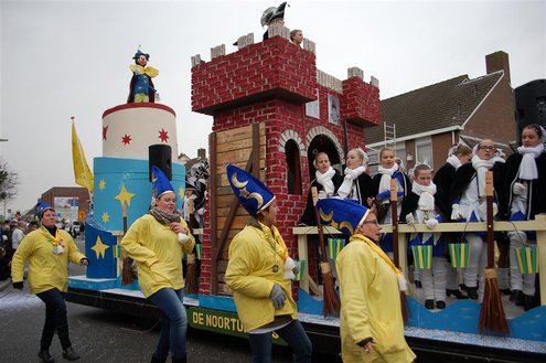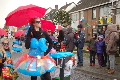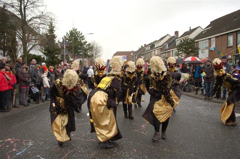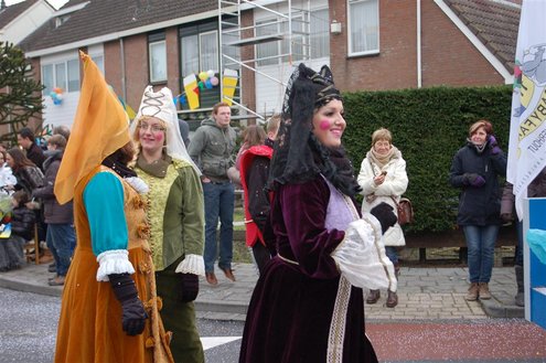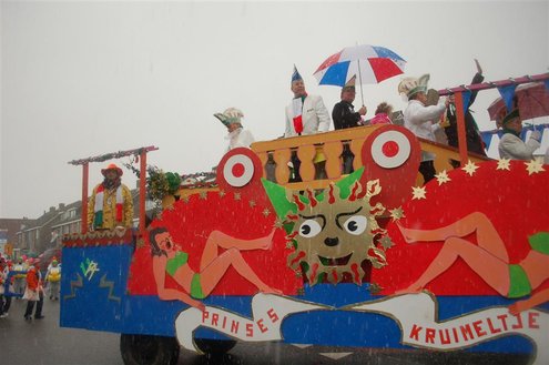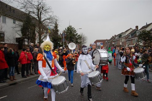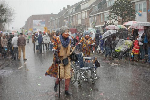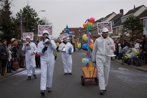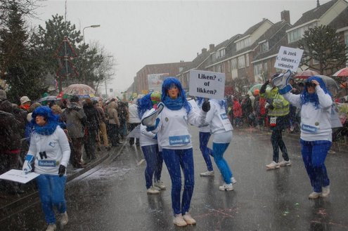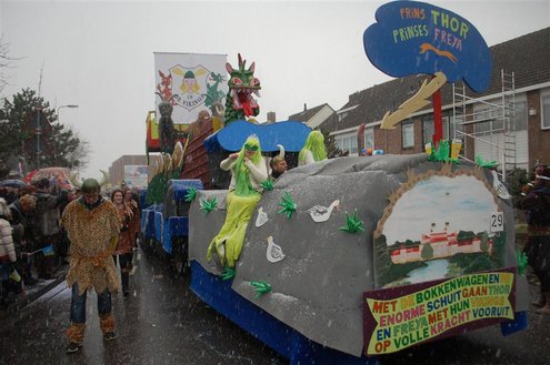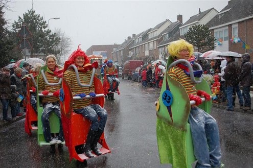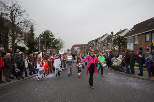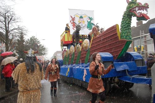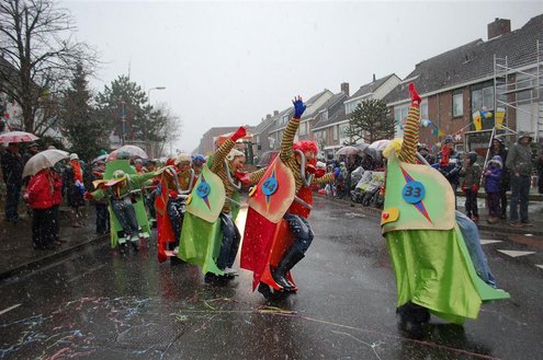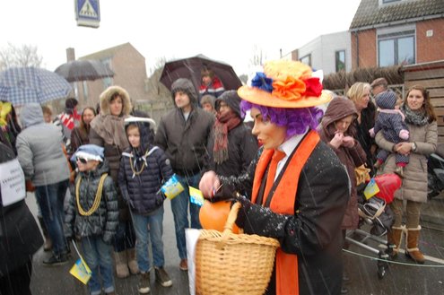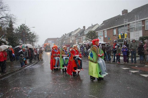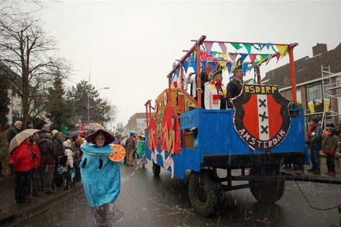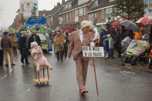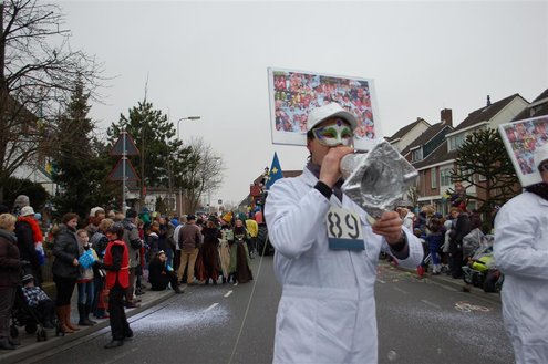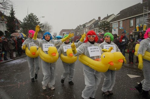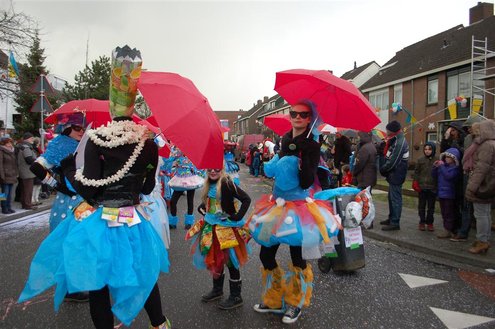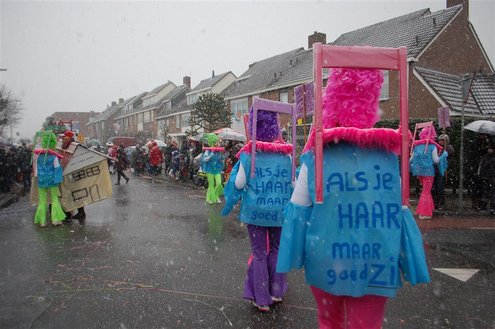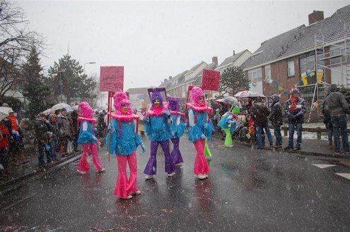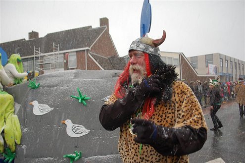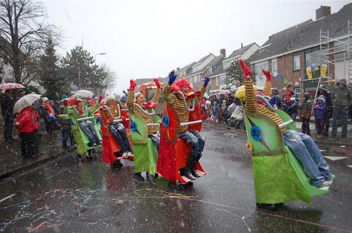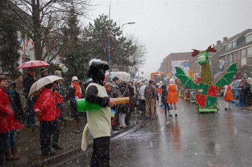 Onder de vrolijke klanken van diverse blaaskapellen, drumbands en fanfares trok vandaag een gezellige carnavalsoptocht door Noordwijkerhout. Na een goed maar enigszins koud begin, begon het even later volop te sneeuwen en viel de optocht niet in het water, maar in de sneeuw. Toch mocht het voor de meeste toeschouwers en de enthousiaste deelnemers de pret niet drukken. (Foto’s : Emile van Aelst)