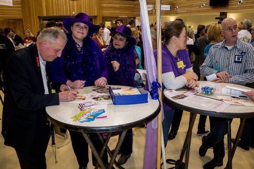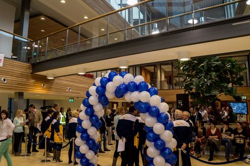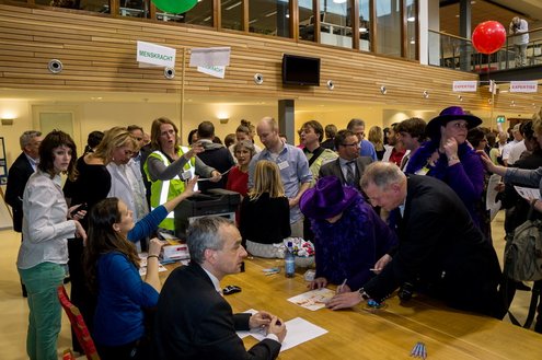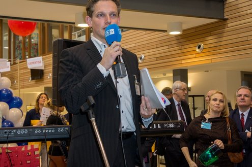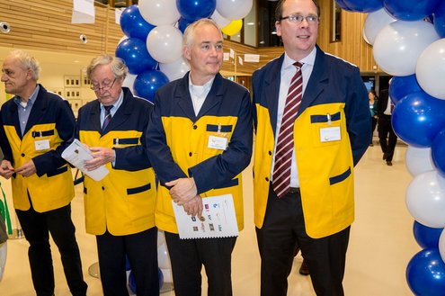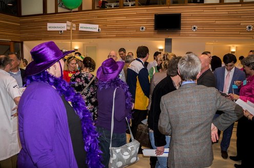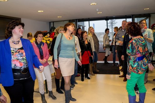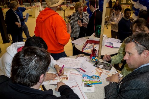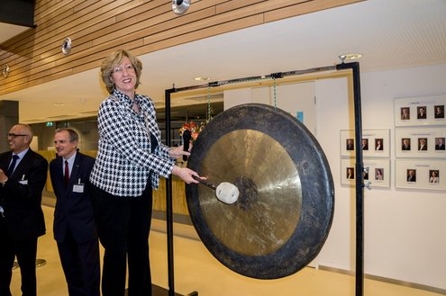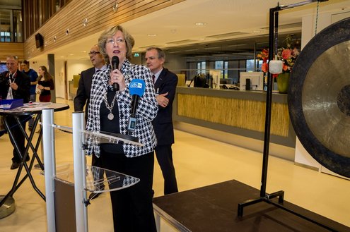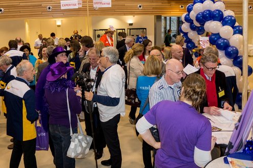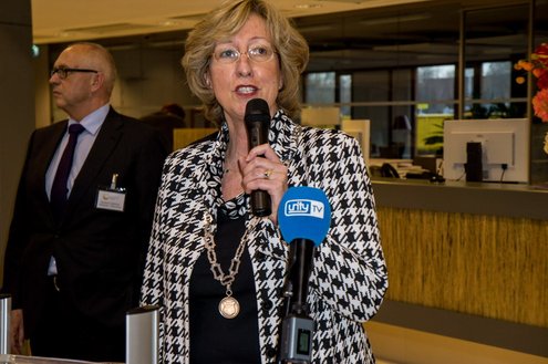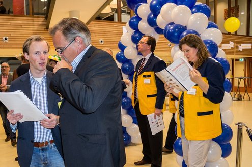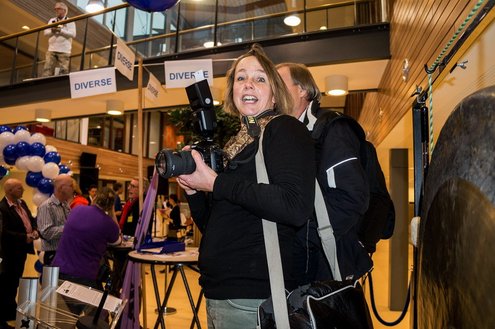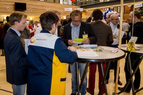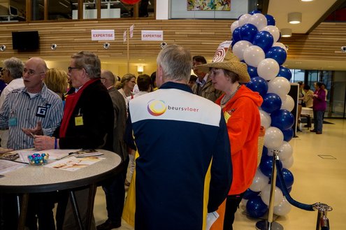Gisteren opende burgemeester Laila Driessen met de welbekende slag op de gong de Beursvloer in Leiderdorp. Het evenement, waarbij bedrijven, stichtingen en verenigingen met elkaar in contact komen en handelen met gesloten beurzen, vond voor de eerste keer plaats en direct al met succes! De belangstelling in het atrium van het gemeentehuis was groot en in totaal waren er 27 organisaties en 23 bedrijven en werden er 118 matches gemaakt. Zo ontstond bijvoorbeeld een mooie samenwerking tussen Kruyt IJzerwarenhandel, de stichting Nadja, de Dwarstuin en Brasserie Park over het opknappen van de natuurspeelplaats in de Bloemerd. Het is een (twee)jaarlijks terugkerend, lokaal evenement waar vraag en aanbod van vrijwilligerswerk in de breedste zin van het woord aan bod komt. (Foto’s: J.P.Kranenburg.)
