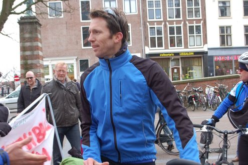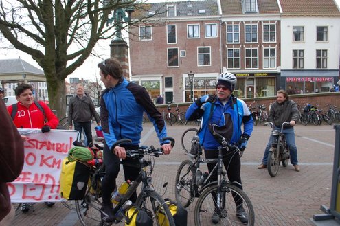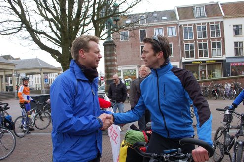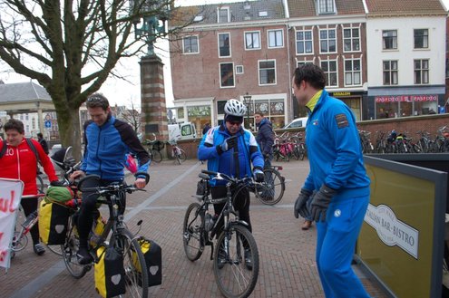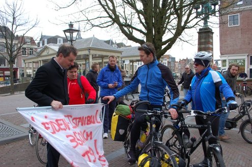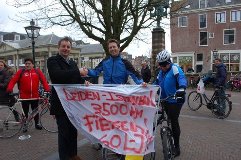 Vanmorgen om 10.00 uur gaf wethouder Frank de Wit het startsein voor ‘Benefiets’ op het Stadhuisplein. De 31-jarige Leidenaar Leendert-Jan Doornbos vertrok hierna op zijn fiets naar Istanbul en hoopt door sponsoring zo’n € 18.000 op te halen. Het geld is bestemd voor een nieuw schoolgebouw in Naivasha, Kenia. Voor de verre fietstocht heeft Doornbos twee maanden beraamd. De eerste € 10.000 zijn al binnen. Meer info: www.benefiets.eu (Foto’s: Emile van Aelst.)