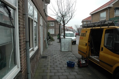 Zo'n drie weken geleden sloeg een verwarde man circa 60 ruiten in de Leidse Zeeheldenbuurt in. Nadat vorige week de ruiten in de deuren al vervangen werden was het vandaag de beurt aan de huiskamerramen. Helaas zijn veel mensen vaak niet thuis waardoor de reparaties minder snel dan mogelijk verlopen. (Foto's: Hidde de Meij)