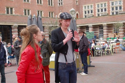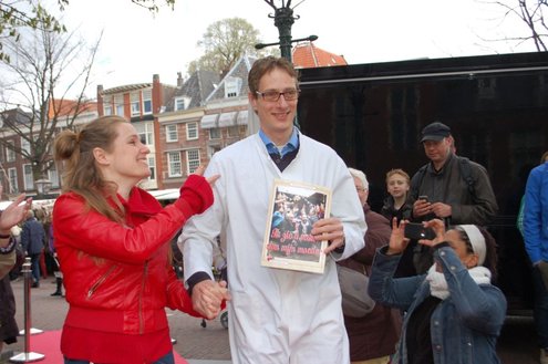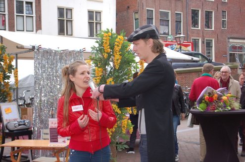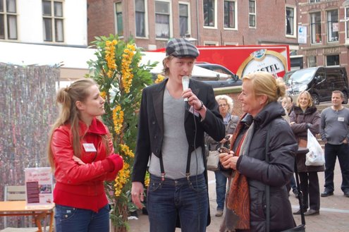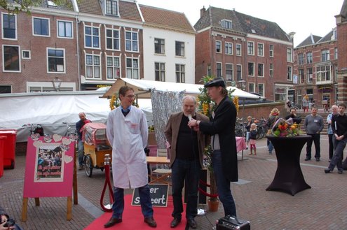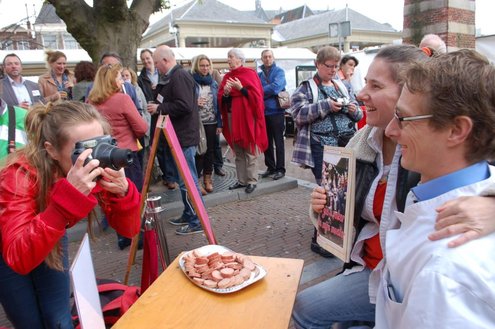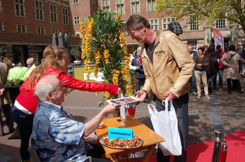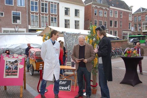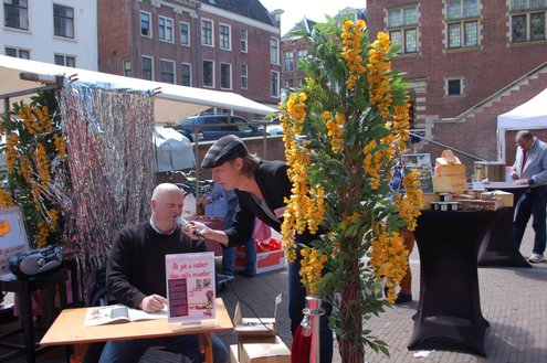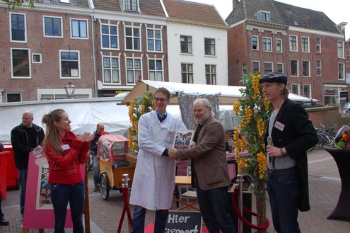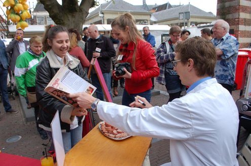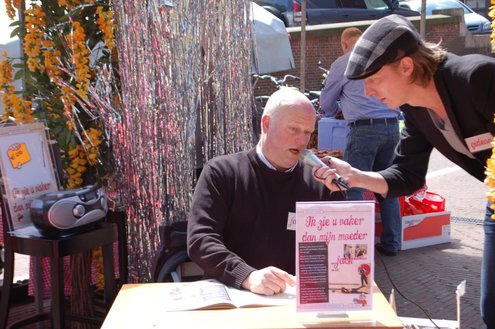 Vandaag overhandigde de in Leiden wonende schrijver/columnist Nico Dijkshoorn het eerste exemplaar van het boekje “Ik zie u vaker dan moeder” aan slager Daan van der Zon. Het boekje is een bundeling interviews met lokale winkeliers verzameld door initiatiefneemster Kristel Boekhorst in samenwerking met stichting Peen en Ui. De gebundelde winkeliers waren de hele middag op het stadhuisplein om met hun klanten op de foto te gaan en de boekjes te signeren.