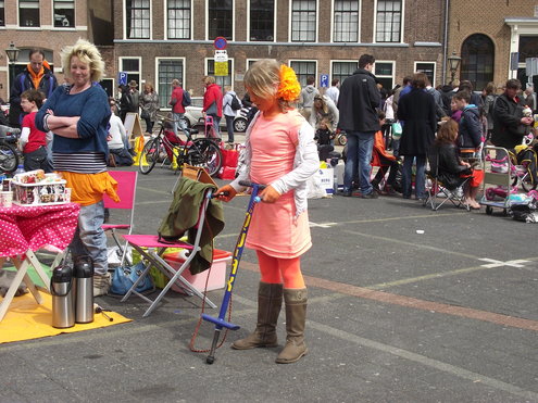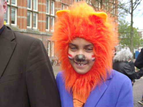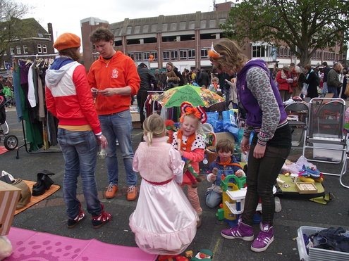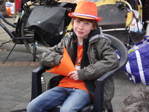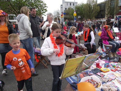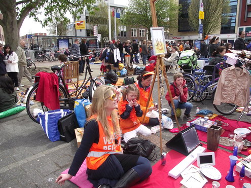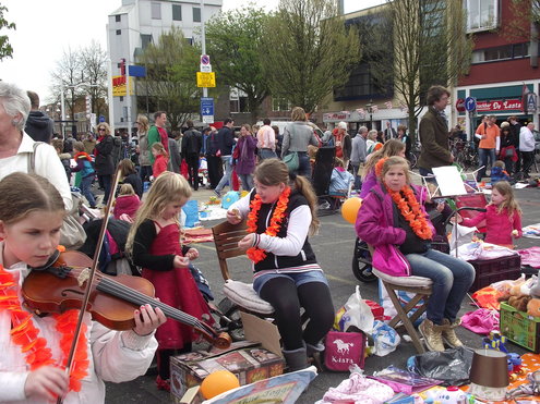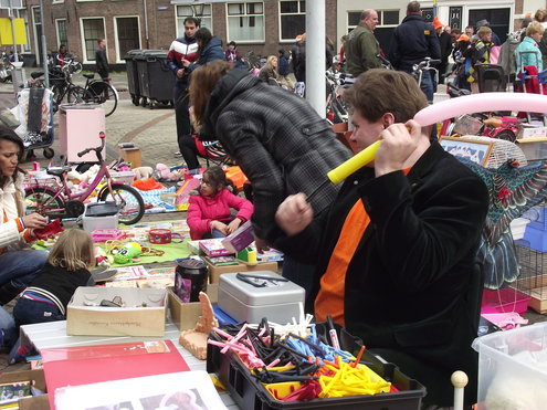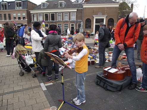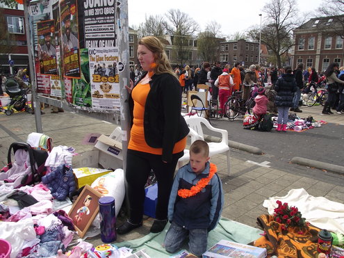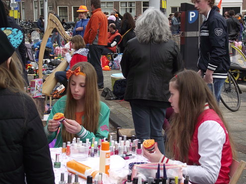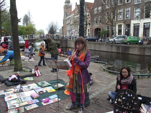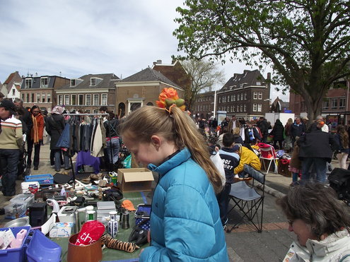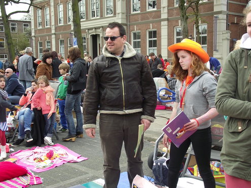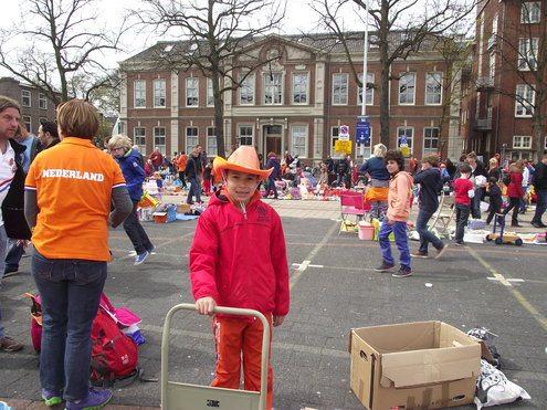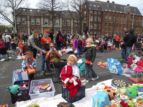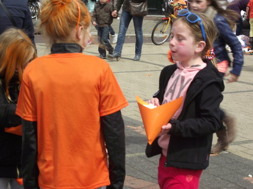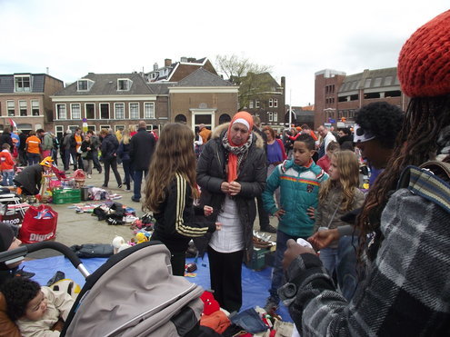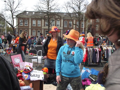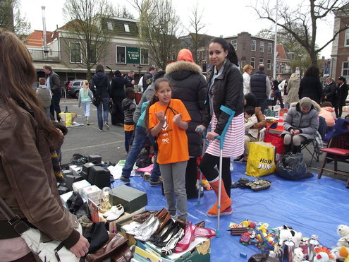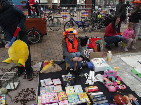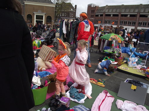 Op de Garenmarkt is het al vanaf vanmorgen vroeg een drukte van belang. Verkopers in de dop, vaak geassisteerd door ouders of grote broers en zussen, hebben hun waren uitgestald of geven muzikale optredens. Met een aarzelend zonnetje en geen wind, is het buiten prima uit te houden. De kids, mooi oranje uitgedost en/of geschminkt, leveren altijd weer leuke plaatjes op. Ook bekende Leidenaar Jochem Myjer werd gespot tussen de kleedjes vol tweedehands spulletjes. (Foto’s: Jacqueline Borg.)