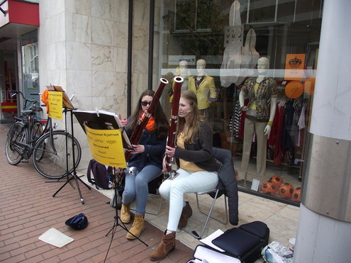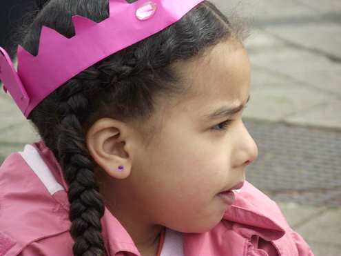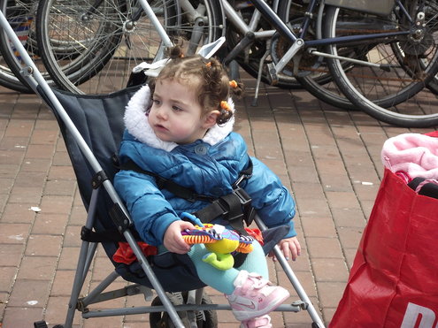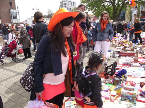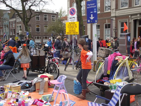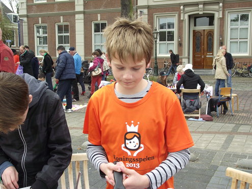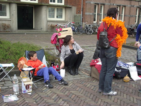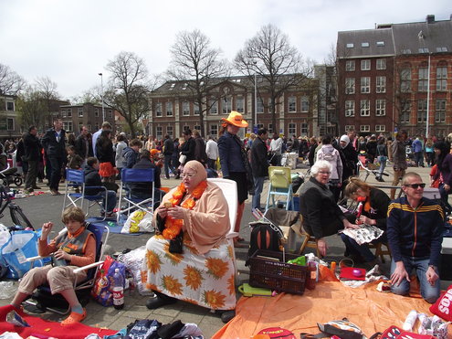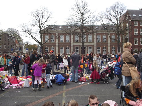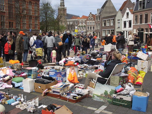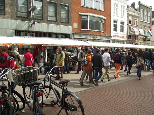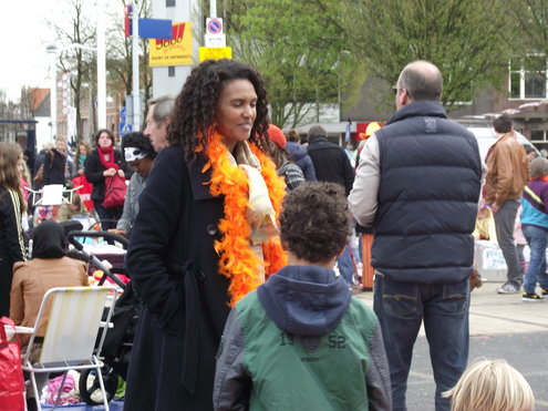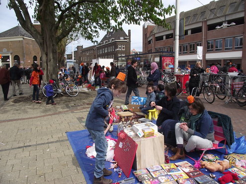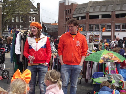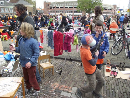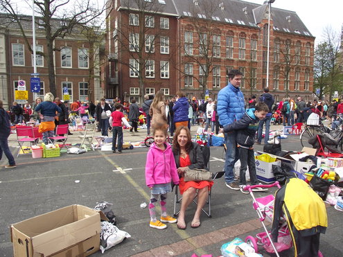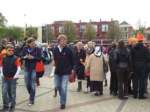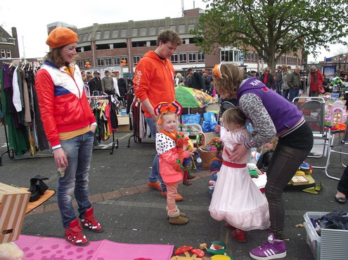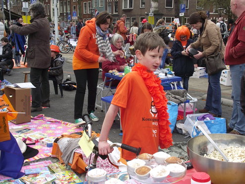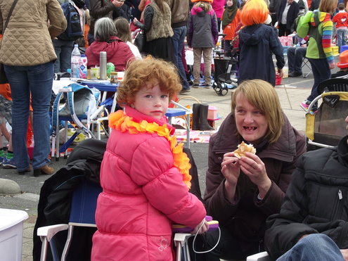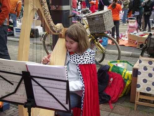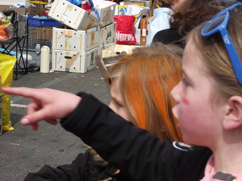 Op de Garenmarkt is het al vanaf vanmorgen vroeg een drukte van belang. Verkopers in de dop, vaak geassisteerd door ouders of grote broers en zussen, hebben hun waren uitgestald of geven muzikale optredens. Met een aarzelend zonnetje en geen wind, is het buiten prima uit te houden. De kids, mooi oranje uitgedost en/of geschminkt, leveren altijd weer leuke plaatjes op. Ook bekende Leidenaar Jochem Myjer werd gespot tussen de kleedjes vol tweedehands spulletjes. (Foto’s: Jacqueline Borg.)