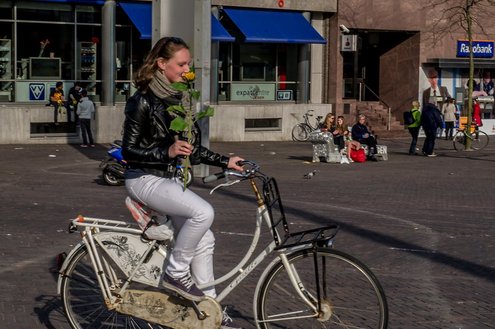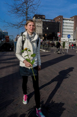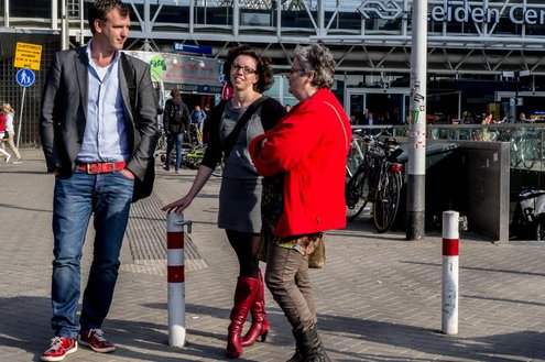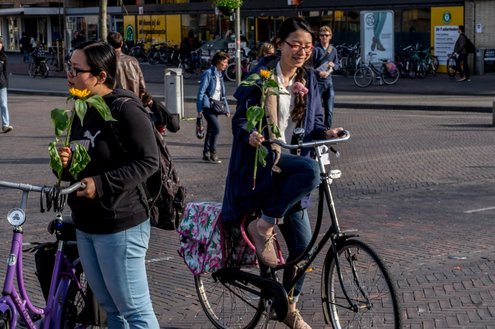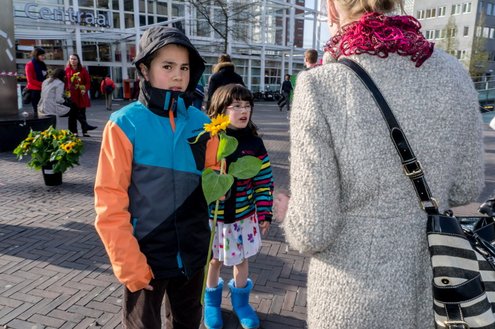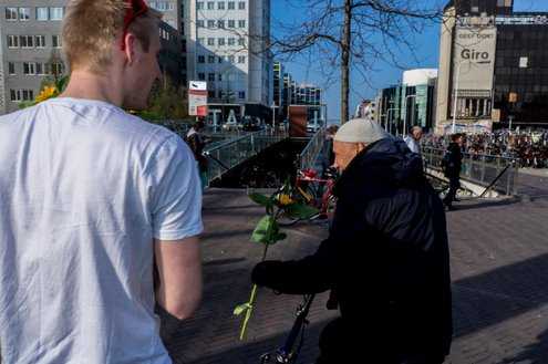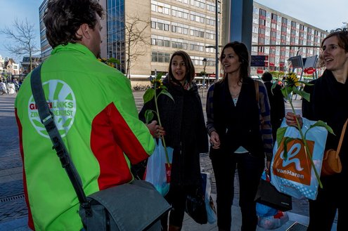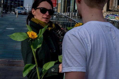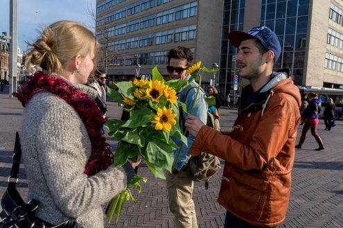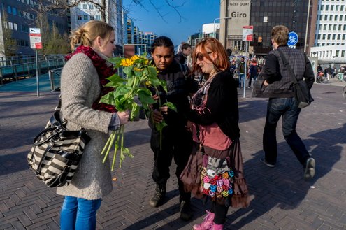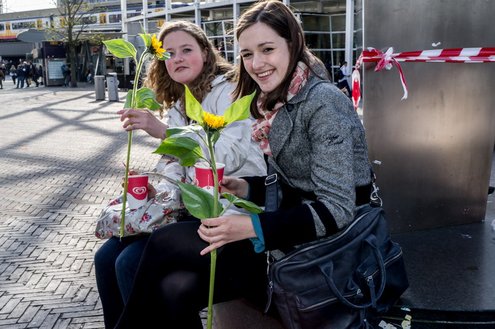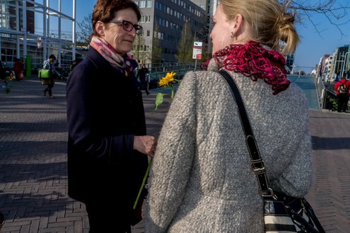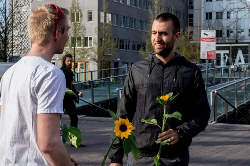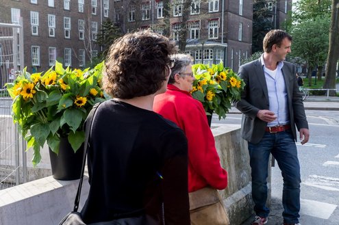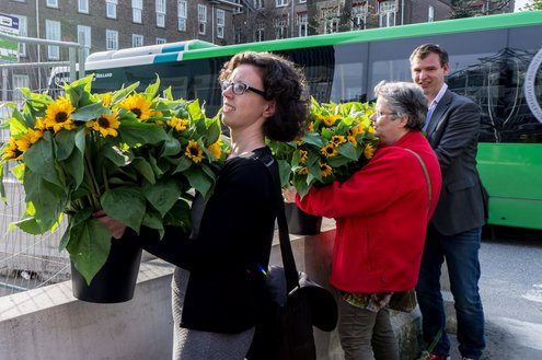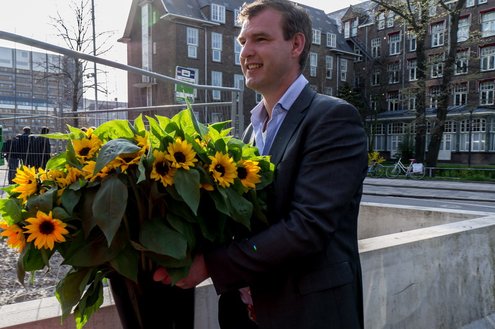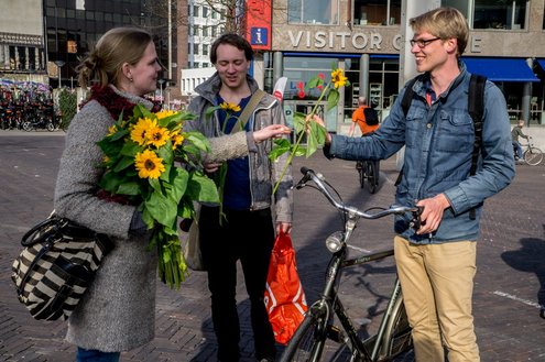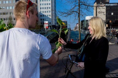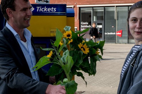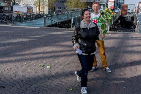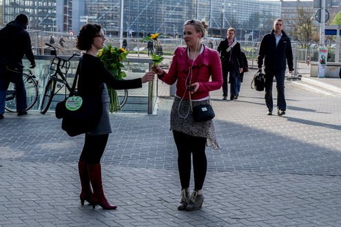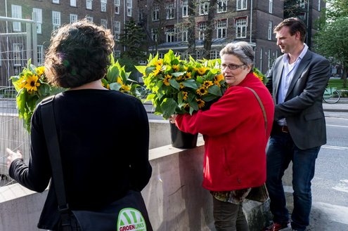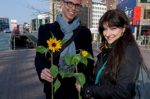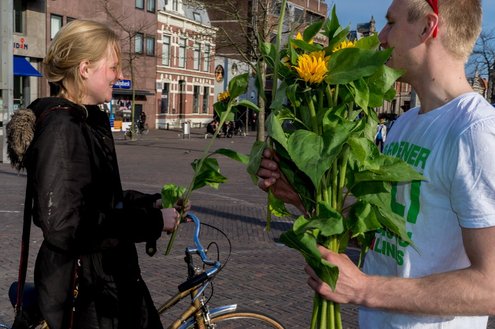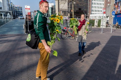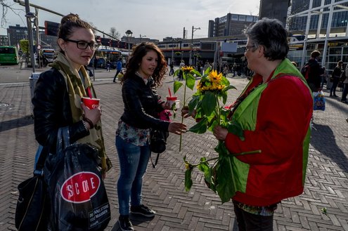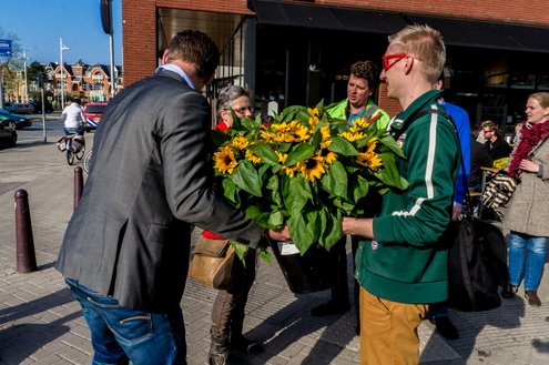 In het kader van ‘sunflower day’, georganiseerd door de internationale ‘Guerilla Gardeners’ deelde GroenLinks gisteravond zonnebloemen uit bij station Leiden Centraal. “Wat is er mooier dan een stad vol vrolijke zonnebloemen?”, aldus fractievoorzitter Pieter Kos. Na het uitdelen van de bloemen trokken kleine groepjes de stad in om op verschillen ‘wilde’ plekken zaadjes te planten. (Foto’s: J.P.Kranenburg.)