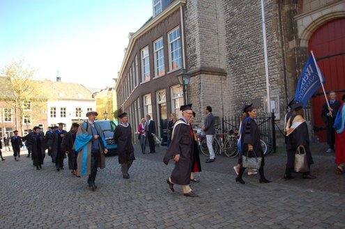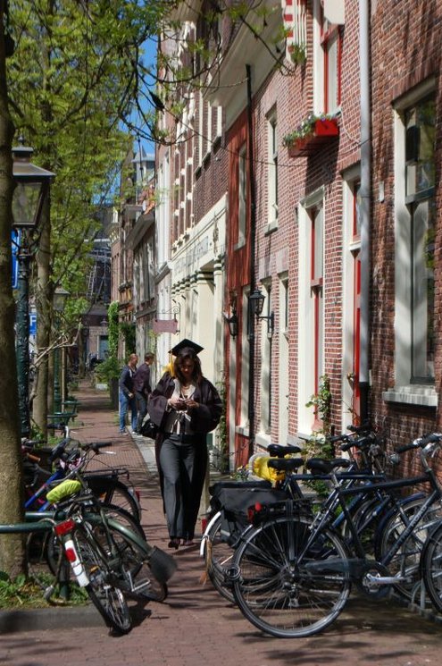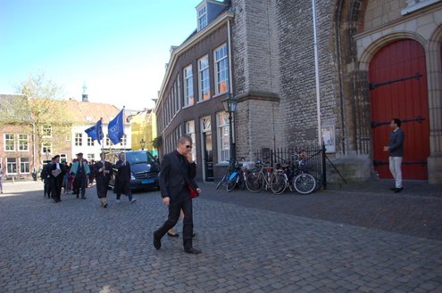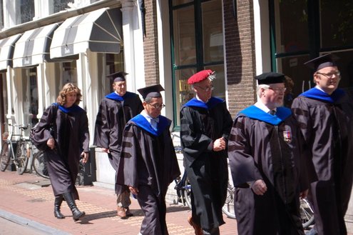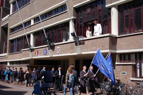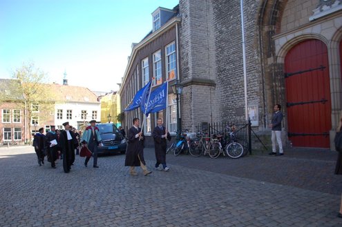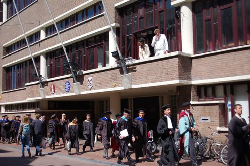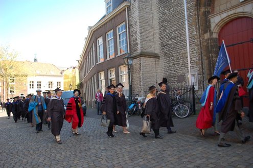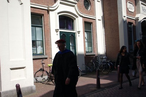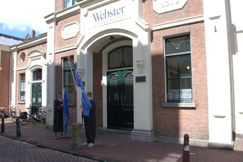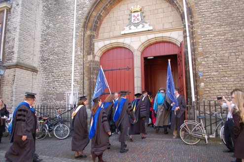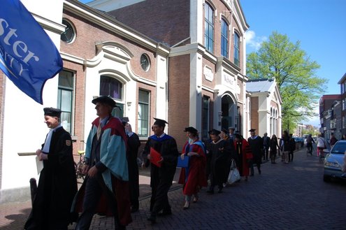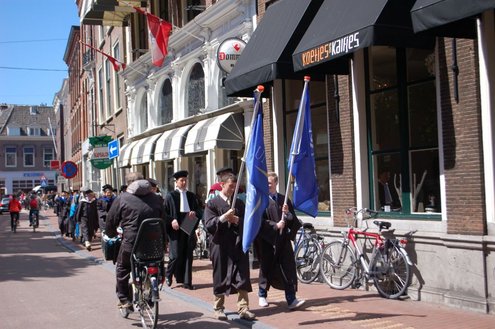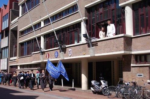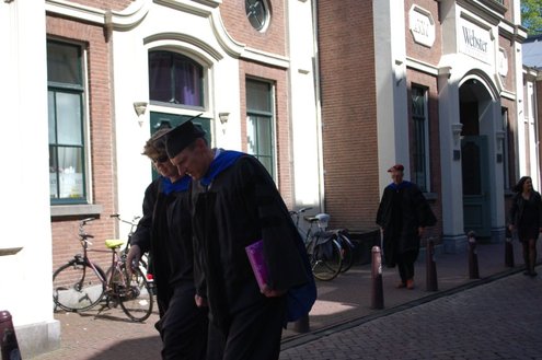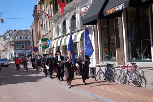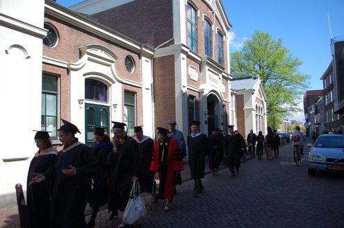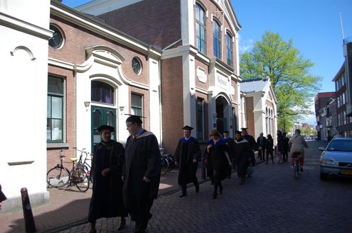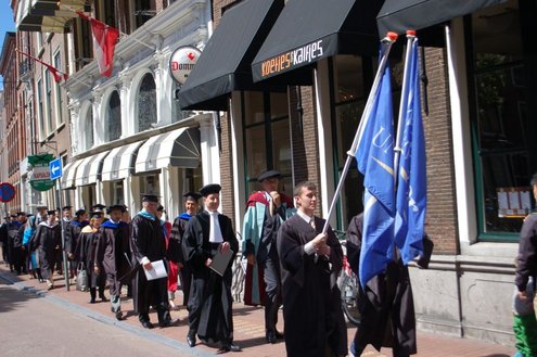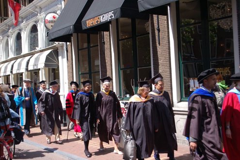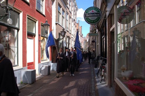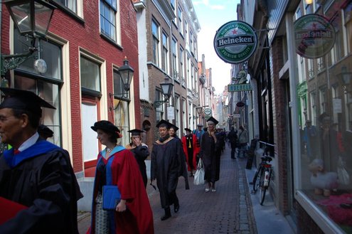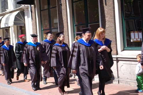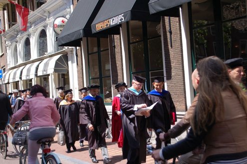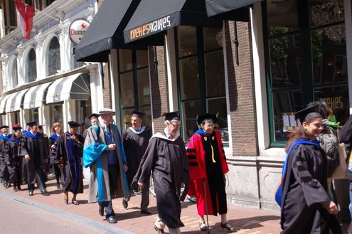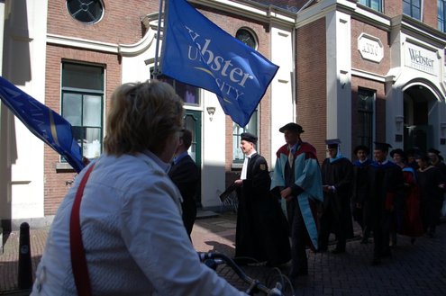Gisteren vond de jaarlijkse ‘Graduation Ceremony’ van de Webster University Leiden plaats in de Pieterskerk. Tijdens de officiële bijeenkomst namen zo’n 70 studenten uit 20 verschillende landen hun diploma in ontvangst. Vanaf de campus op de Boommarkt liepen studenten en docenten in processie naar de Pieterskerk. Prof. Dr. van Marissing, de Algemeen Directeur van Webster en Dr. Jacques Kaat, Academisch Directeur zaten de plechtigheid voor. De afstuderende studenten werden toegesproken door mevrouw Fatou Bensouda, Prosecutor of the International Criminal Court (internationaal Strafhof Den Haag). Emile van Aelst fotografeerde de markante stoet op weg naar de Pieterskerk.