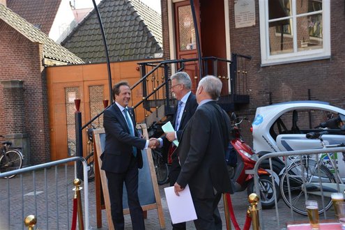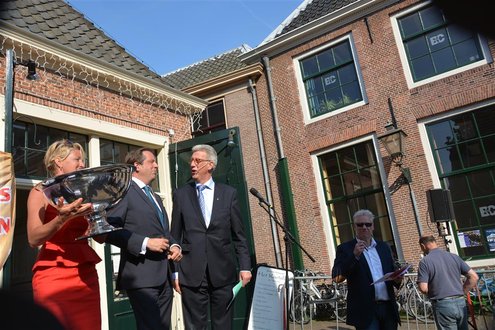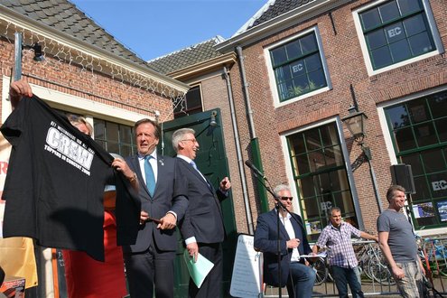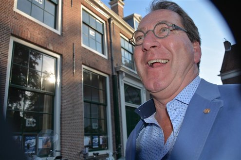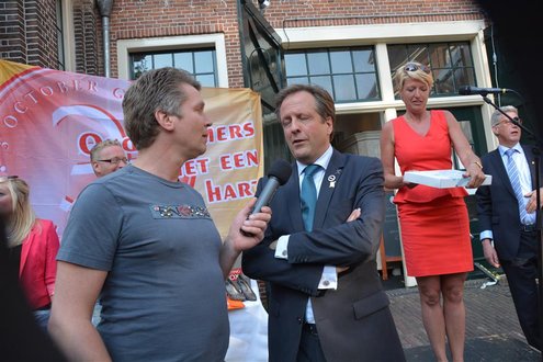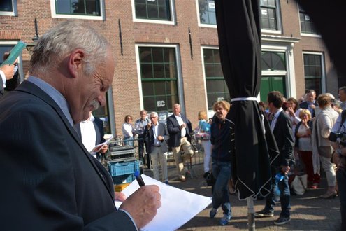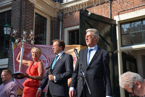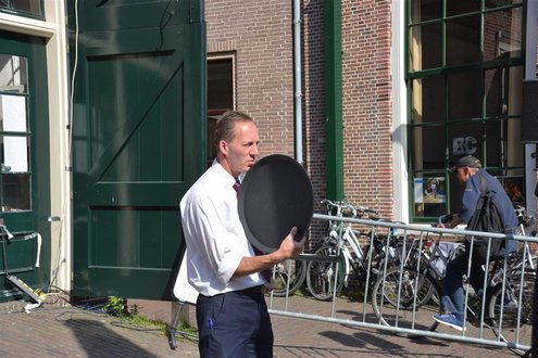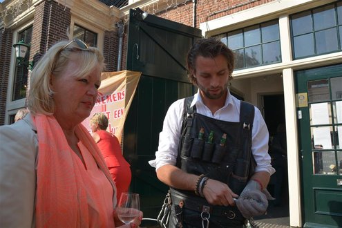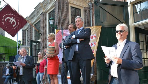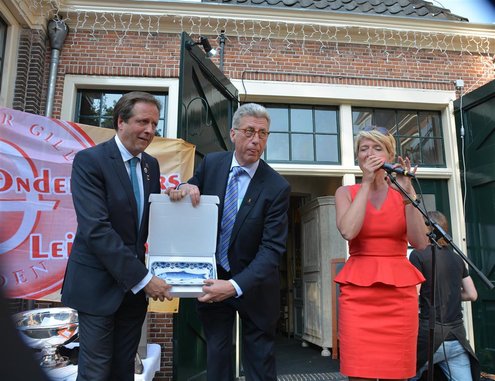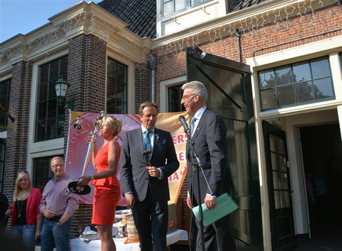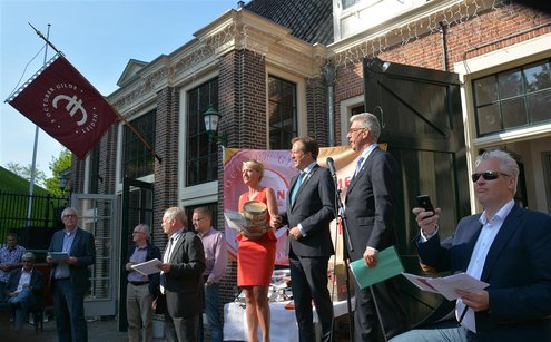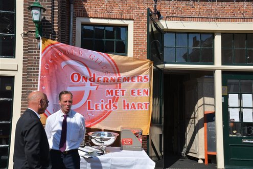 Veilingmeester Alexander Pechtold hamerde 12.500 euro bij elkaar. Voorzitter Gerda Schukking van het 3 Octobergilde is in haar nopjes met het bedrag dat dit jaar wordt besteed aan de Hutspotmaaltijd en aan 'verduurzaming' van de verlichting van de Taptoe, zodat de kinderen niet meer tussen de walmen van de dieselaggregaten hoeven te lopen. (Foto’s: Emile van Aelst).