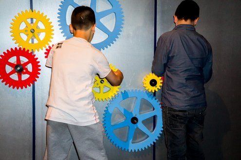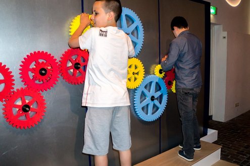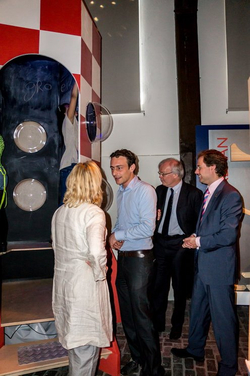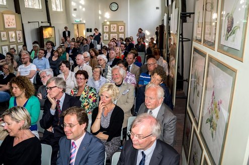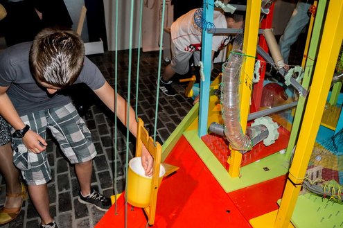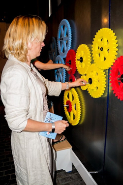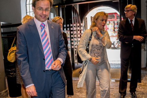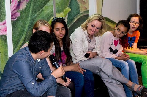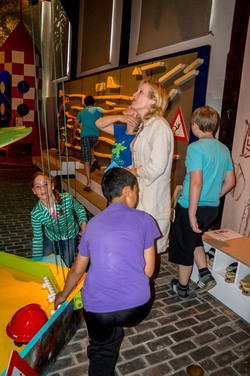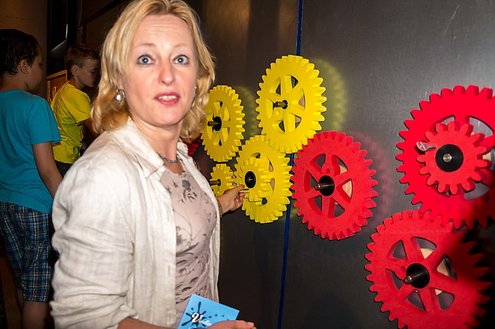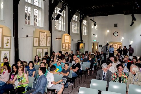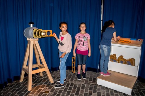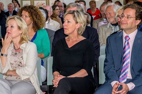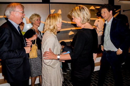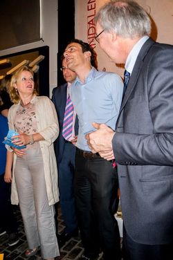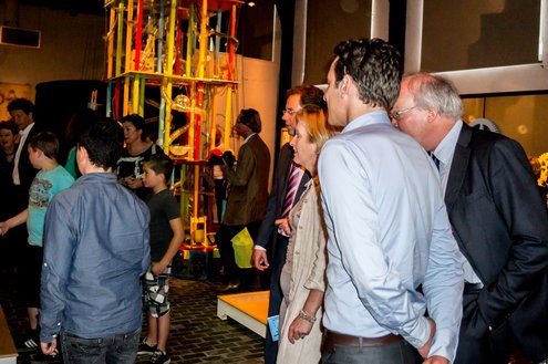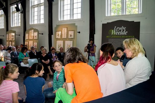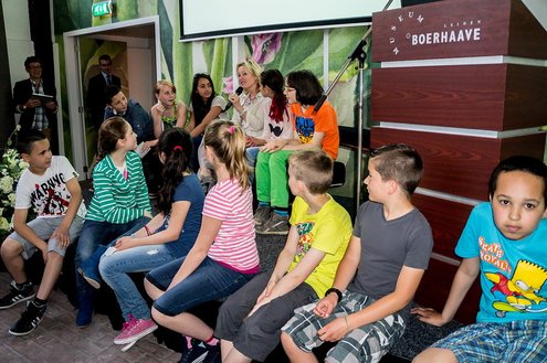 Vanmorgen opende minister Bussemaker de nieuwe doe-tentoonstelling voor kinderen in Museum Boerhaave. Onder de titel ‘Vindingrijk’ kunnen de kids op een leuke manier kennismaken met de uitvingen van Christiaan Huygens. Na een kort welkomstwoord van directeur Dirk van Delft, werd de minister geïnterviewd door kinderen uit groep 7 van de Lucas van Leyden basisschool. De leerlingen stelden hun eigen vragen over uitvindingen en Bussemaker nam de tijd om zo zorgvuldig mogelijk te antwoorden. Vervolgens scheurden ze gezamenlijk een grote poster open, die de zaal nog even verborg. Samen met de kinderen genoot de minister van de interessante spelletjes, zoals de megaknikkerbaan, een telescoop met Saturnus in het vizier en een raket vol verhalen over buitenaardse wezens. (Foto’s: J.P.Kranenburg.)