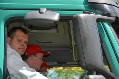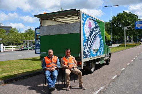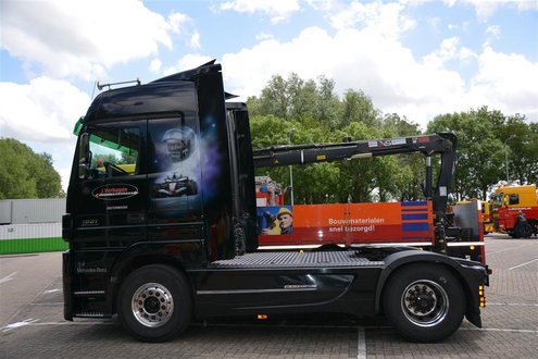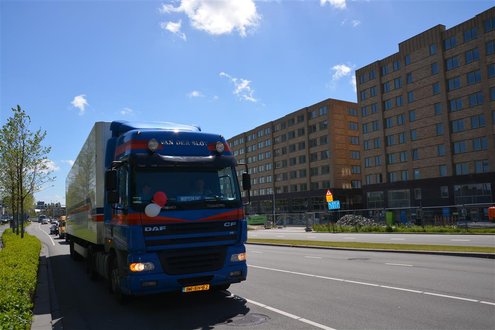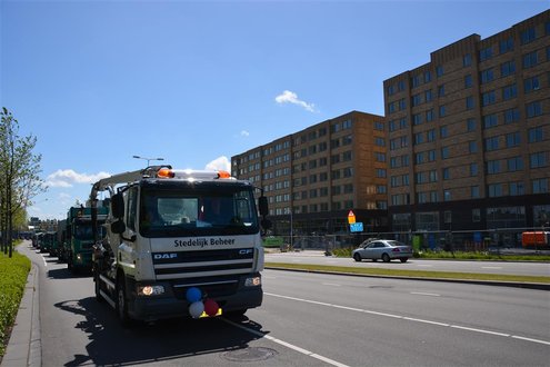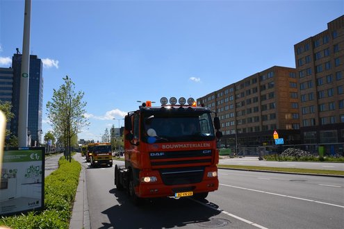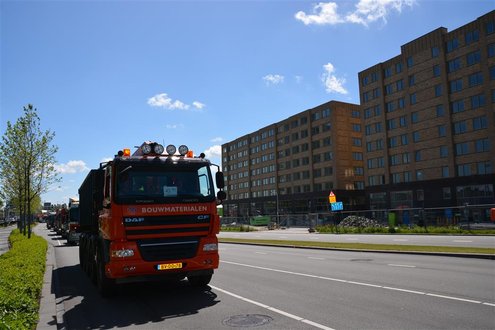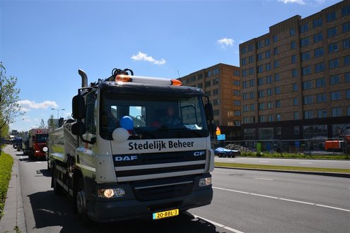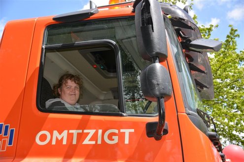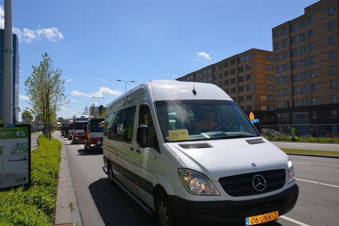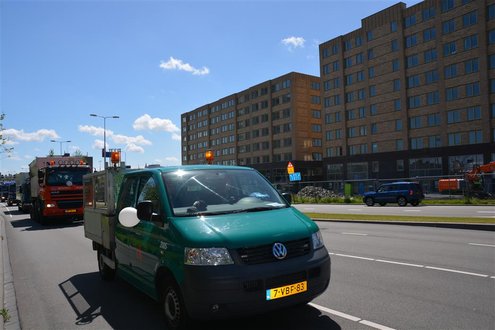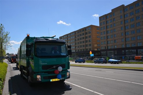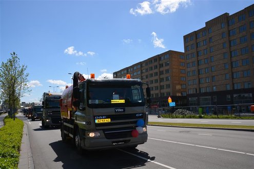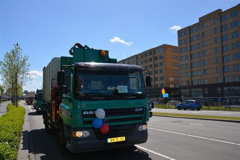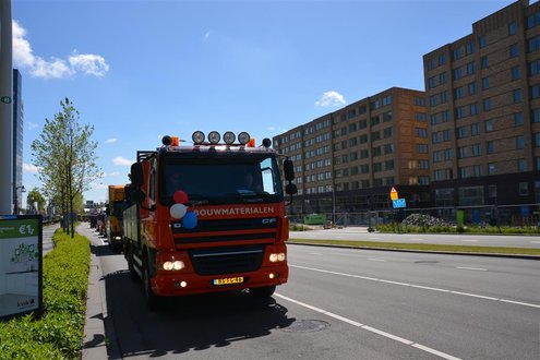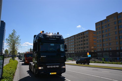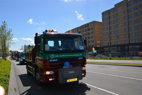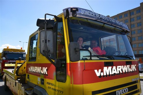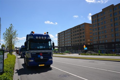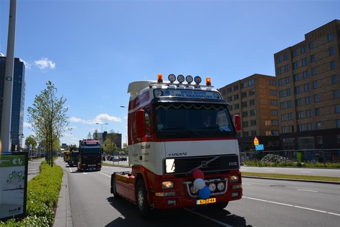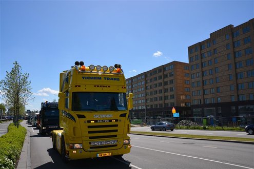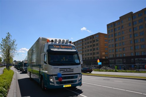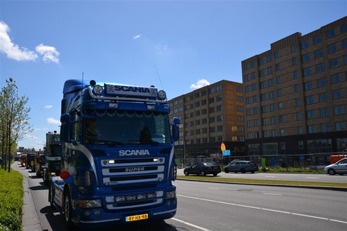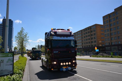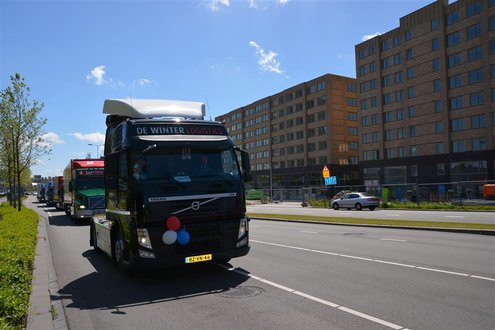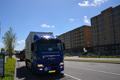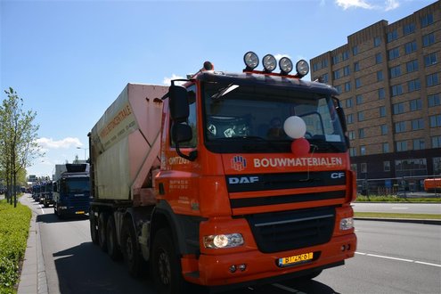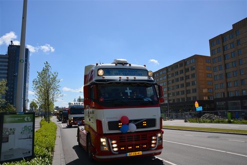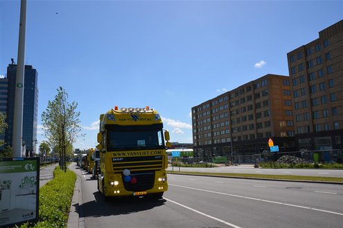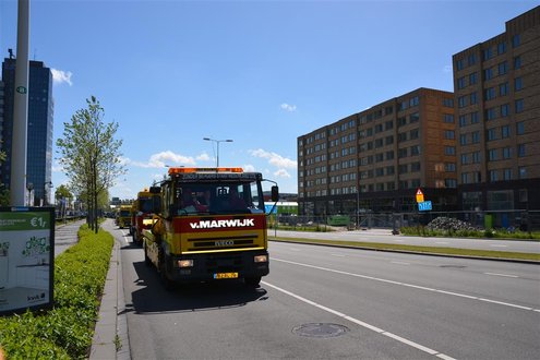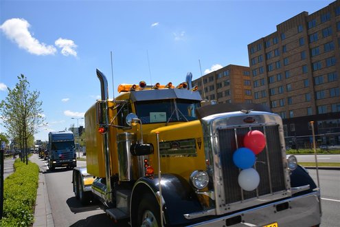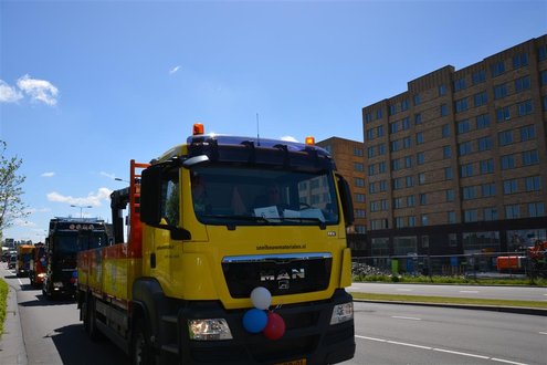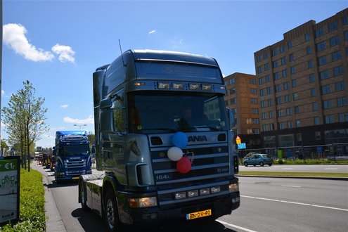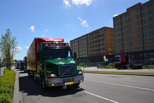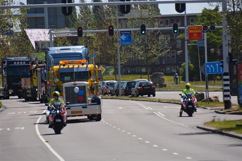 Vanmorgen reden 58 vrachtwagens voor een wel heel ‘exceptioneel transport’ door Leiden en het Groene Hart. Aan boord zaten zo’n 80 mensen met een geestelijke of lichamelijke beperking, die al tijden hebben uitkeken naar deze steeds weer onvergetelijke dag. Op initiatief van Lions Club Leiden Oude Rijn en vergezeld van het Motor Begeleidings Team, 35 ervaren vrijwilligers en motoragenten van Politie Hollands Midden, trok een lint van vrachtauto’s van Alphen aan de Rijn, via Roelofarendsveen naar Leiden en weer terug naar het Heinekenterrein in Zoeterwoude. De Toetertoer werd voor de negende keer gehouden. (Foto’s: Emile van Aelst.)