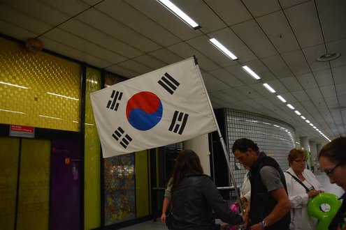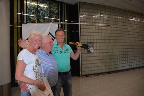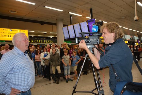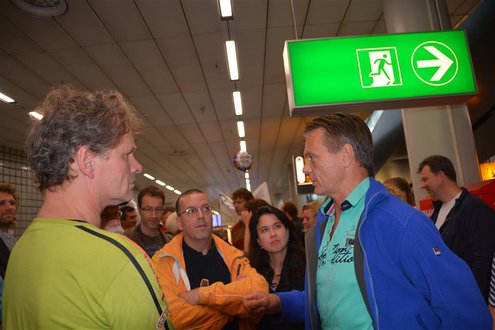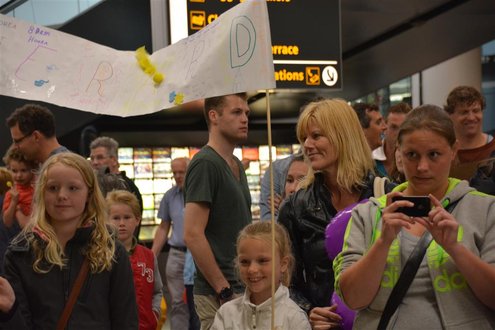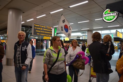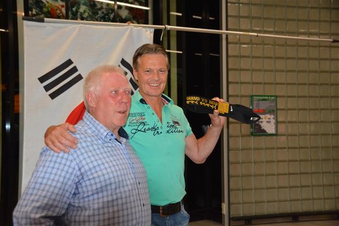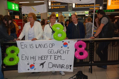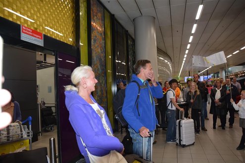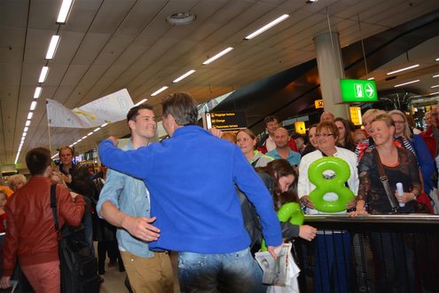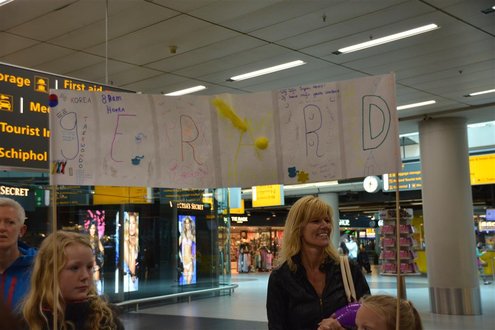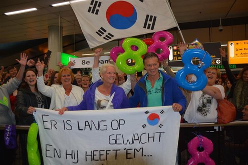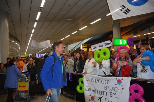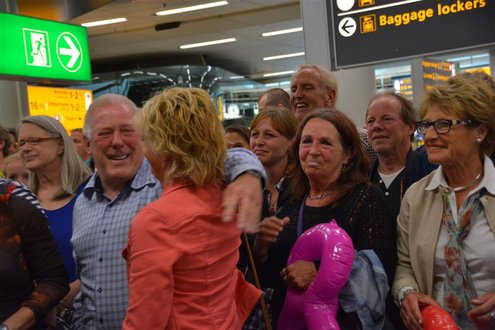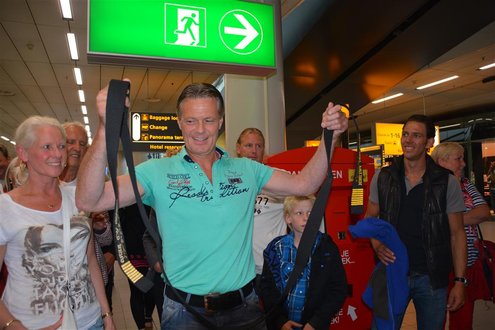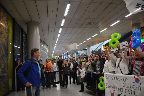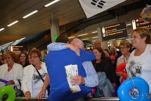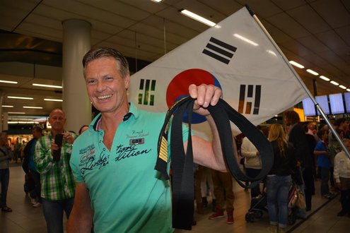 Gisteravond verzamelde zich een groep Leidenaren in de aankomsthal van Schiphol om Gerard van de Berg warm te onthalen. Van de Berg arriveerde vanuit Korea waar hij als eerste Nederlander de achtste Dan Taekwondo heeft behaald. Zijn oude leermeester Aad van der Luit sloot hem trots in zijn armen. (Foto’s: Emile van Aelst.)