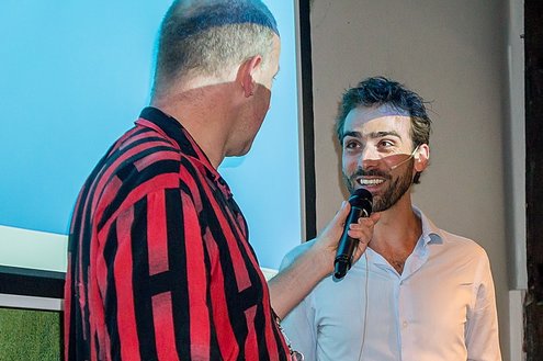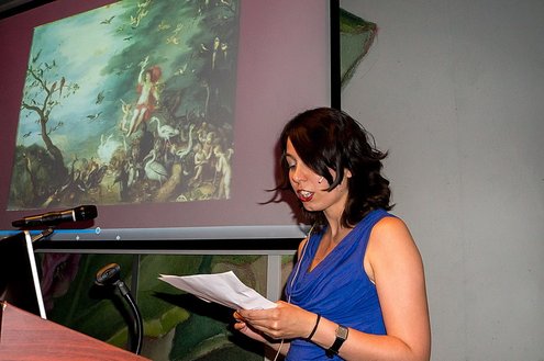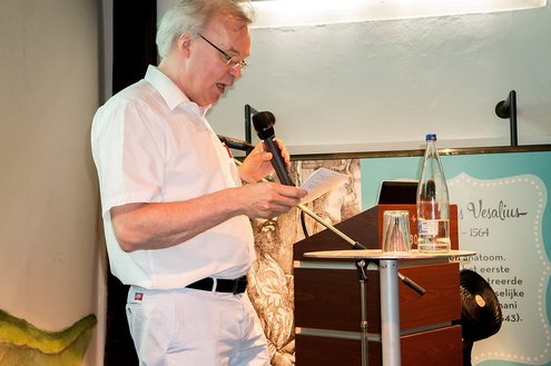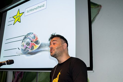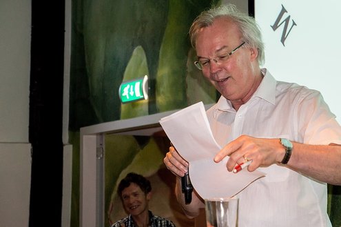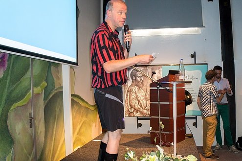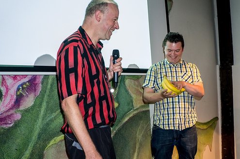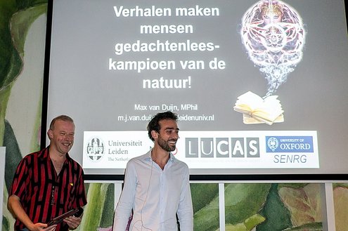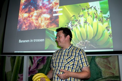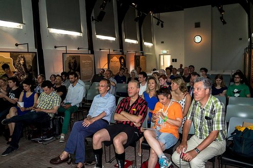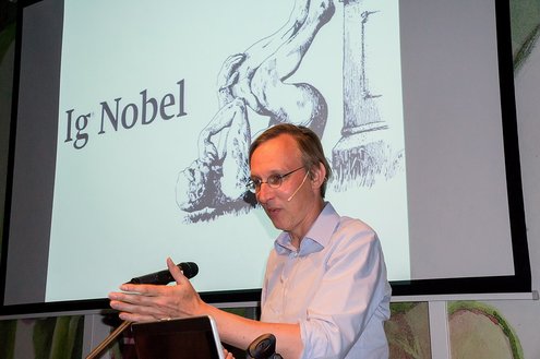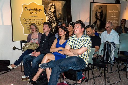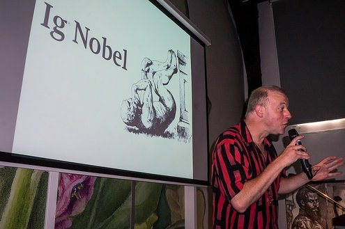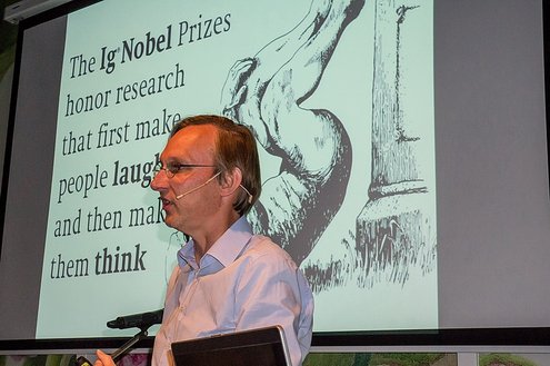 Gisteren gingen zes jonge Leidse wetenschappers een spannende strijd aan in het kader van ‘Ig Nobel 24/7 Battle’ in Museum Boerhaave. In deze tweede halve finale presenteerde elke deelnemer zijn of haar onderzoek ‘op niveau’ in exact 24 seconden aan het publiek, gevolgd door een samenvatting ‘voor de leek’ in slechts zeven woorden. Winnaar werd Wessel Valkenburg, die samen met Menno Schilthuizen doorgaat naar de grote finale. De deskundige jury bestond uit Dirk van Delft, directeur Museum Boerhaave, Kees Moeliker van Het Natuurhistorisch in Rotterdam en een dame uit de zaal (leek) Agnes Valkhof; scheidsrechter was Maarten Keulemans, chef wetenschap Volkskrant. De finale vindt plaats op 14 september, als onderdeel van de tweede Nederlandse ‘Ig Nobel Night’ in de Leidse Stadsgehoorzaal.