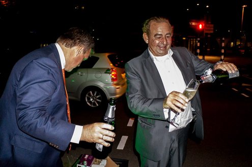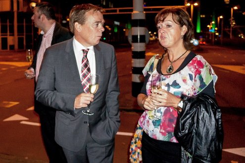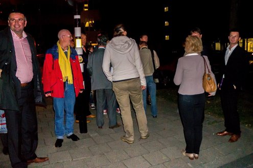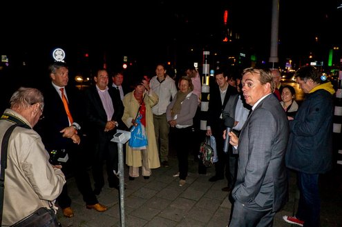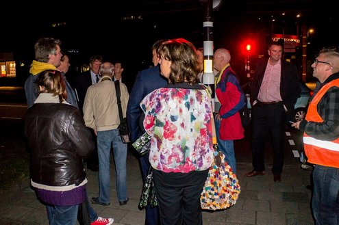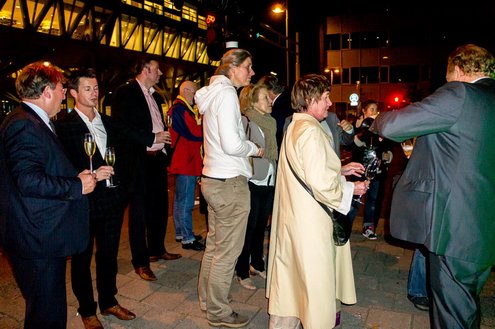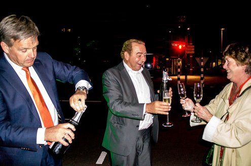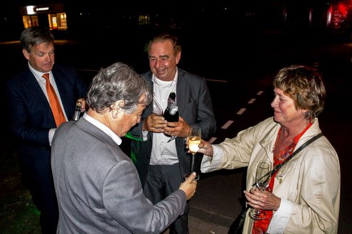 De ondernemers van het Business Platform Schipholweg brengen een toast uit op de nieuwe verlichting. "Het is net een landingsbaan", vindt penningmeester Eric van Mastrigt. (Foto's: J.P. Kranenburg).