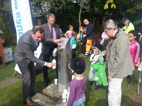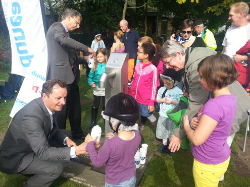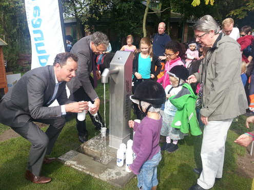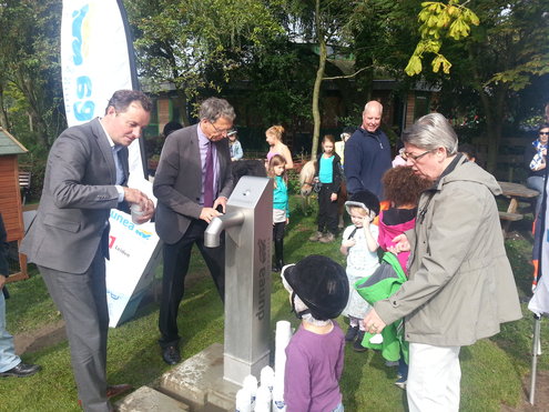 Wethouder de Wit onthulde het watertappunt bij de kinderboerderij in de Merenwijk samen met sectormanager water Ad de Waal Malefijt van Dunea.