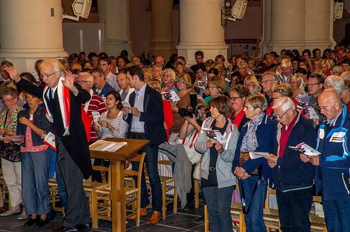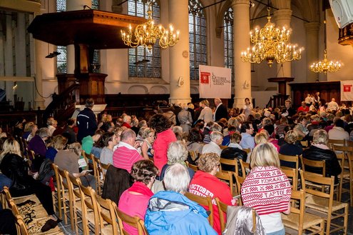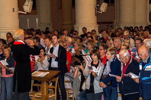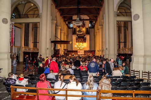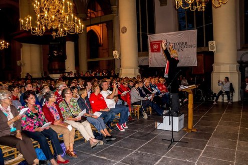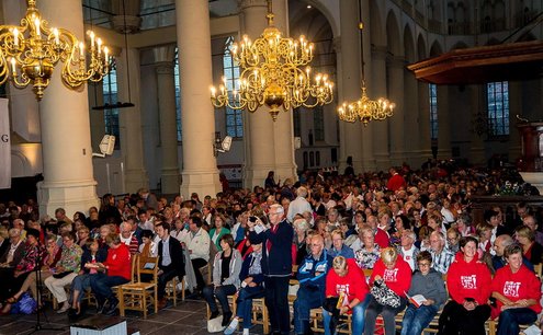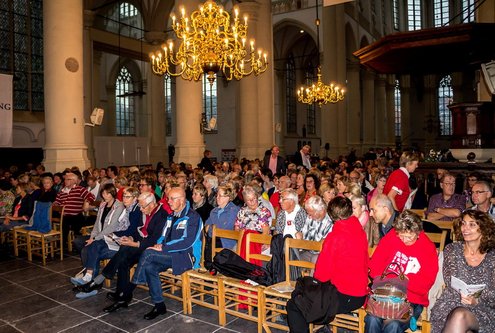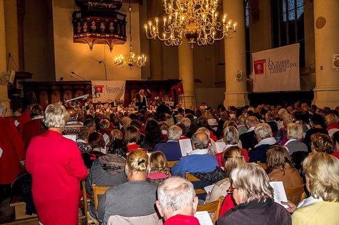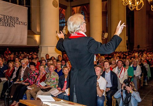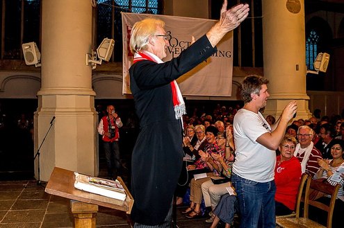 Meeer dan 1000 mensen kwamen woensdagavond naar de Hooglandse Kerk om onder leiding van dirigent Wim de Ru de koraalliedjes te oefenen die op 3 oktober worden gezongen in het Van der Werfpark. Voorzitter Eric Filemon van de Commissie Herdenking van de 3 October Vereeniging is opgetogen: “We hadden 1000 stoelen neergezet en er zijn zelf mensen die moeten staan. Niet zo leuk voor de penningmeester, maar verder is het een geweldig succes”.
