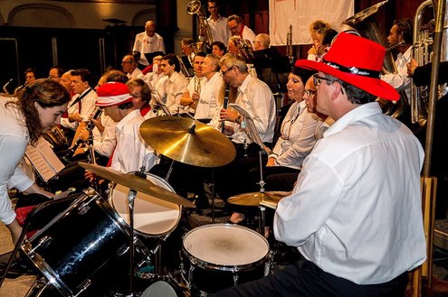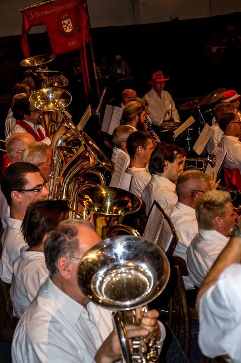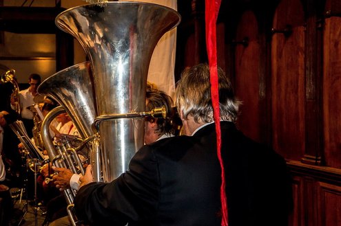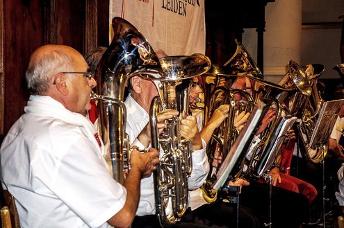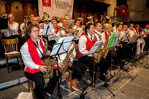 Wim de Ru gaf weer op geheel eigen wijze leiding aan de koraalzangers in de Hooglandse Kerk. De liedjes werden gezongen op de muziek van Concordia, Werkmans Wilskracht en de Schlűsselstadtmusikanten. (Foto's: J.P. Kranenburg, video: Chris de Waard).