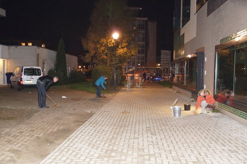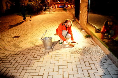 Geschrokken bewoners vegen het glas bij elkaar van de kapotgevallen gevelplaat van Het Gebouw. (Foto's: Sleutelstad).