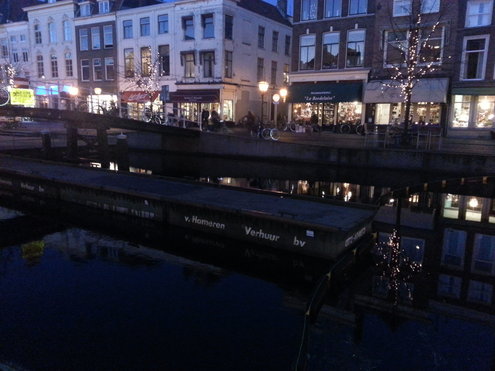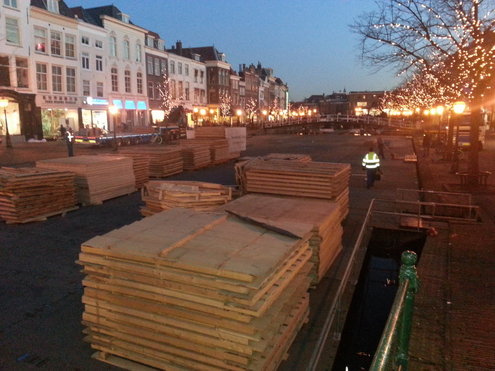 De ijsbaan op de Nieuwe Rijn is inmiddels een paar dagen open, maar toch wordt er nog hard gewerkt op het water bij de Koornbeursbrug. Dit maal aan de andere kant. Daar wordt de komende dagen een drijvende kerstmarkt opgebouwd met 40 kerststalletjes en een heuse kerktoren. Via de pontons kunnen de bezoekers onder de Koornbeursbrug door lopen van de ijsbaan naar de kerstmarkt en vice versa. De kerstmarkt gaat aanstaande zaterdag open.