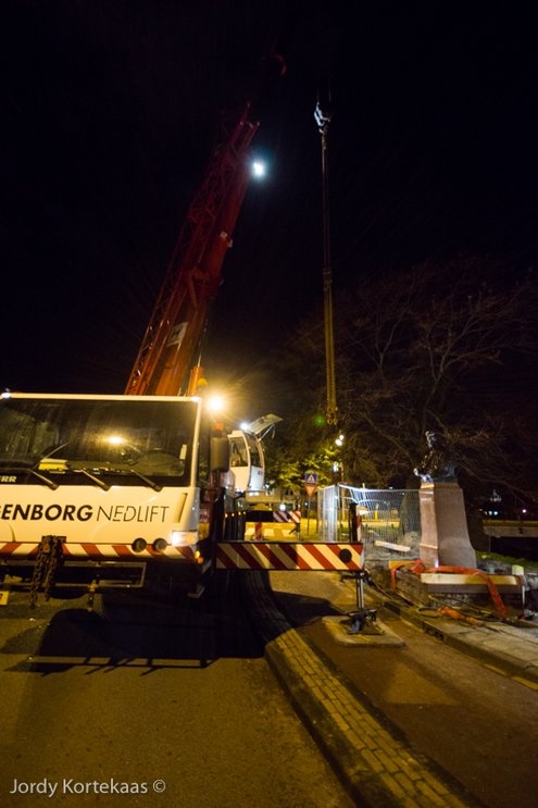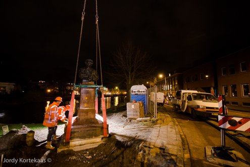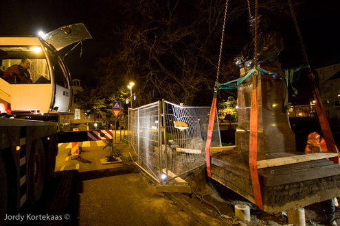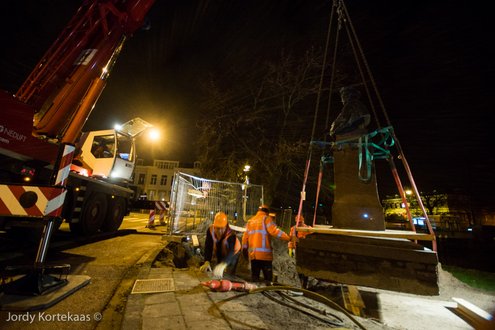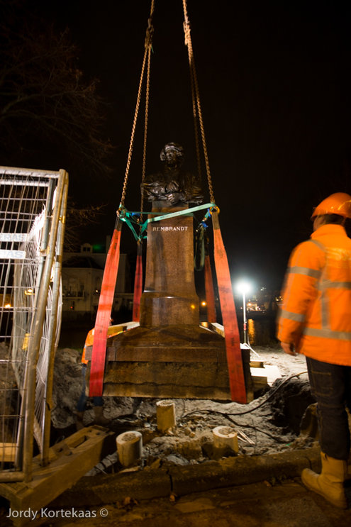 Rembrandt kijkt op zijn nieuwe plek niet meer recht vooruit, maar heeft zijn blik gericht op het Noordeinde. (Hoofdfoto: Chris de Waard, reportage verplaatsing: Jordy Kortekaas).
