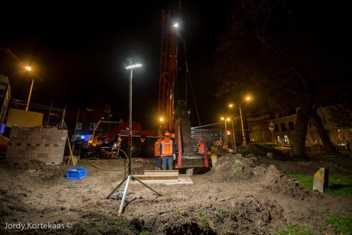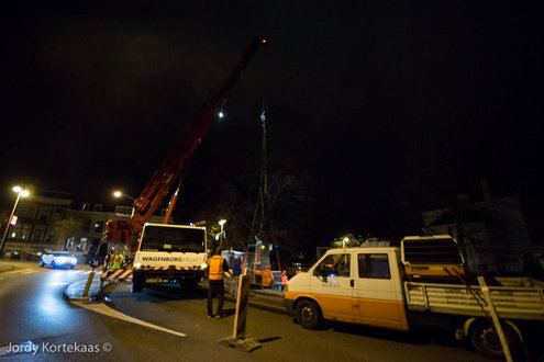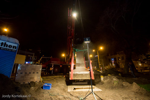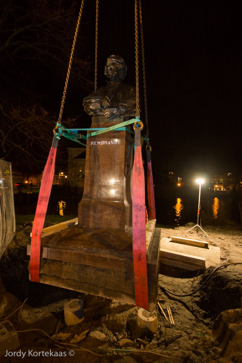 De Witte Singel werd vrijdagavond afgezet om plaats te maken voor een grote kraan die de ruim 11.000 kilo zware buste van Rembrandt moest verplaatsen. Hoewel het maar om een paar meter ging, was het toch nog een flinke klus die daar op de kop van de Witte Singel werd geklaard. Inmiddels staat het beeld op z’n nieuwe plek. Iets meer naar het water en een kwart slag gedraaid.