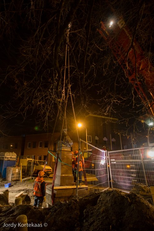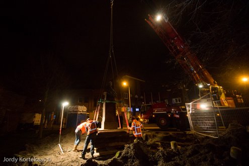 Het wachten is nog op de nieuwe bestrating rondom het beeld. Ook moet de aanlichting nog worden aangesloten.