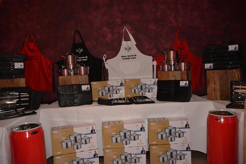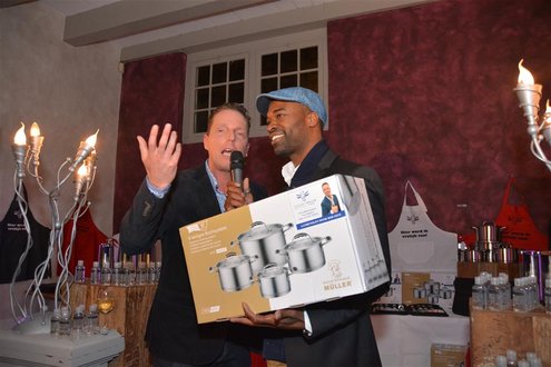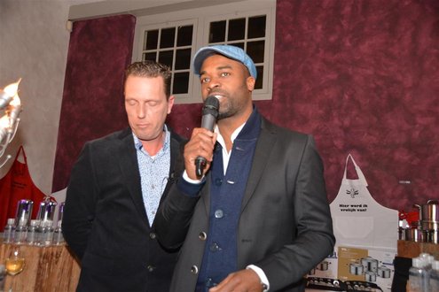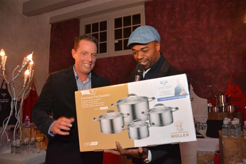 Rob Geus overhandigt eerste pannenset aan topkok Raymond Beuk. (Foto's: Emile van Aelst)