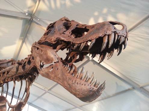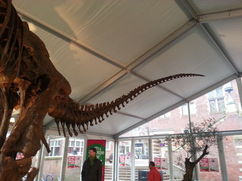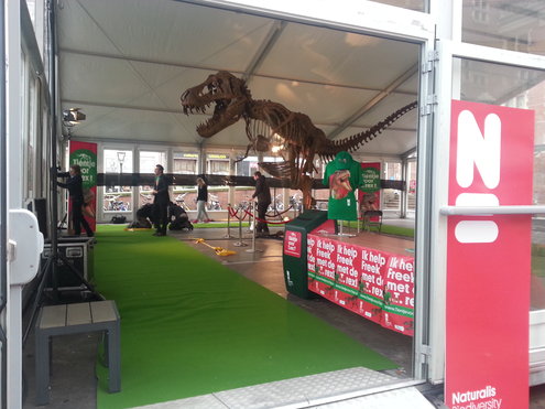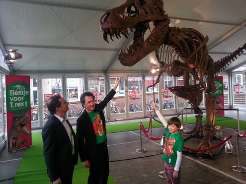 De actie ‘Een tientje voor T. rex‘ waarmee Naturalis een miljoen euro hoopt op te halen is gisteren uitgebreid met de onthulling van de dino-replica in een grote tent op het Stadhuisplein. Directeur Peter Rijntjes van het biodiversiteitscentrum gaf samen met wethouder De Wit de aftrap. Direct daarna stroomde het publiek naar binnen om met T. rix op de foto te gaan.