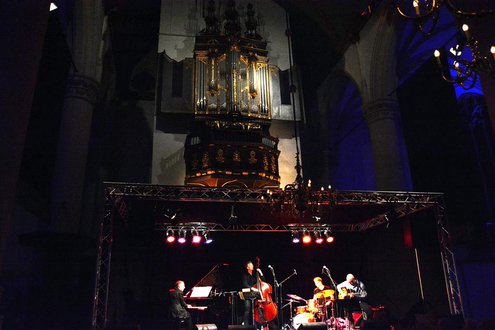 Het eerste optreden gisteravond loog er niet om: Martijn van Iterson formeerde een quintet met onder meer Karel Boehlee. Later stapte ook Humphrey Campbell nog het podium op. Organisator van de jazz-optredens in de Hooglandse Kerk is Colin van Gestel van Jazz- en Wijncafé De Twee Spieghels. Naast het programma in de Hooglandse Kerk zijn er optredens in Muziekhuis QBUS waar Hans van Polanen drie dagen lang voor een vol podium zorgt met achtereenvolgens Club Des Belugas, Kris Berry & Perquisite en het Hypnotic Brass Ensemble.