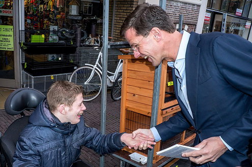 Premier Rutte in gesprek met een gehandicapte jongen. Foto: J.P. Kranenburg
