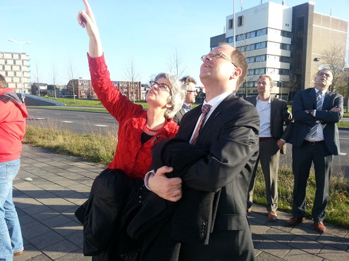 Wethouder Van Woensel en directeur Gerda van den Berg van woningcorporatie De Sleutels hebben vanmiddag het bouwbord onthuld van het poroject ‘Van Voorthuijsen’ op de hoek van de Willem de Zwijgerlaan en de Gooimeerlaan. De Sleutels ontwikkelt daar 178 sociale huurwoningen.