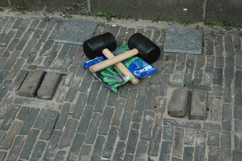 Mark van Praag (links) en Robert Strijk leggen de eerste blauwe stenen in de Breestraat. (Foto's: Chris de Waard).