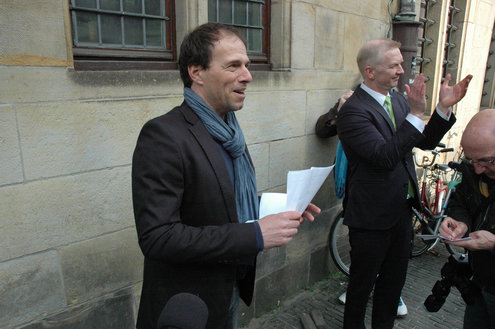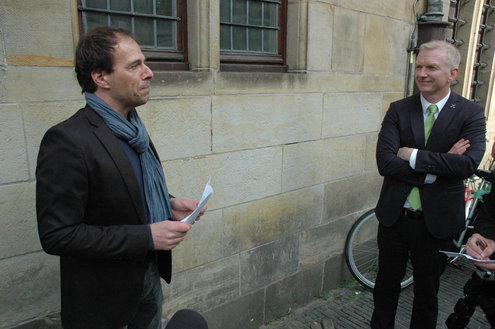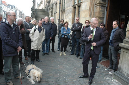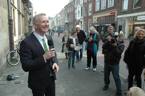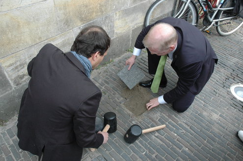 Gistermiddag is een symbolische start gemaakt met de eerste fase van de herinrichting van de Breestraat. Wethouder Robert Strijk en winkeliersvoorzitter Mark van Praag legden voor het stadhuis twee blauwe steentjes. Na de herinrichting die eind juni van start gaat – na de Leiden Marathon – heeft de Breestraat aan beide zijden van die blauwe stoepen tot een meter uit de gevels.