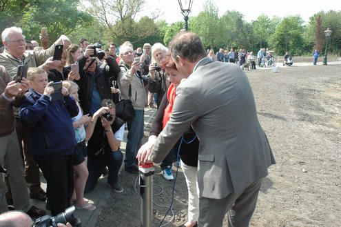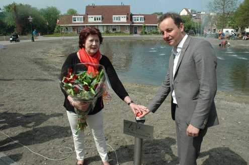 Met een druk op de knop stelde wethouder Frank de Wit samen met voorzitter Henny Hoogervorst van de Vereniging tot Behoud en Bescherming Kooipark (VBBK) de fontein in werking. daarmee was het geheel opgeknapte Kooipark officieel open. (Foto's: Chris de Waard).
