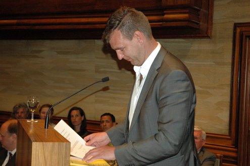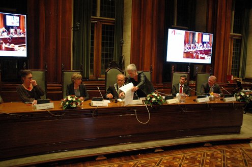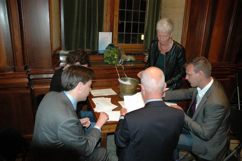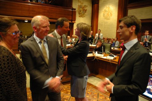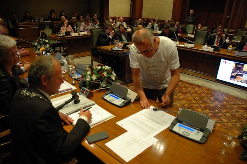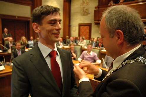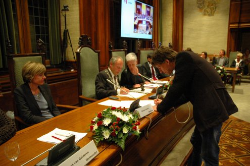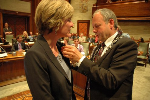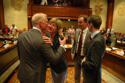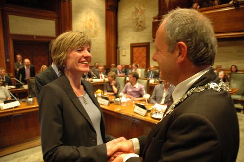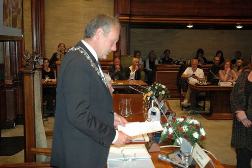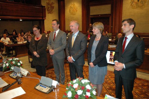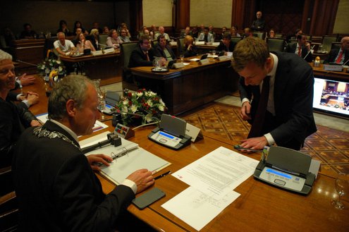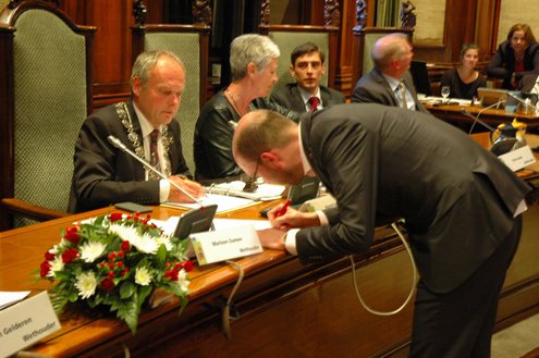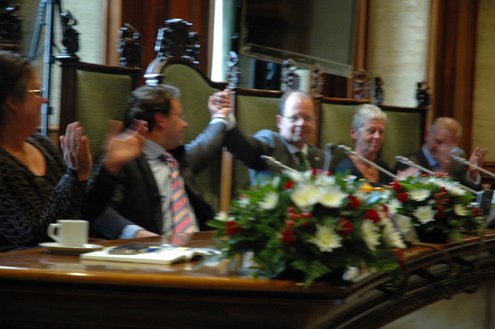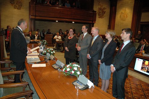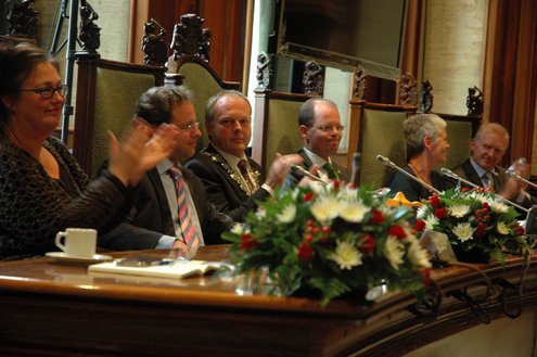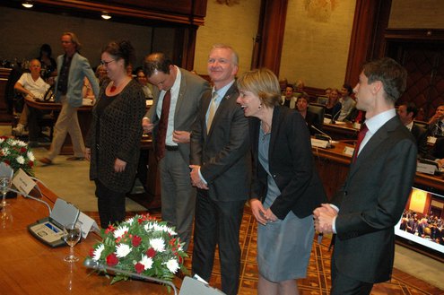 Om 20.00 uur werden de politici weer in de Raadzaal verwacht. Daar werd het coalitieakkoord door alle negen fractievoorzitters geduid. Daarna was het tijd voor het benoemen van de nieuwe wethoudersploeg. Drie zittende wethouders, Roos van Gelderen, Robert Strijk en Frank de Wit, werden herbenoemd. De PvdA keert na vier jaar oppositie terug in het college met Marleen Damen als wethouder met de portefeuilles Werk en Inkomen en Financiën. Paul Laudy treedt namens de VVD toe tot het stadsbestuur. Hij volgt Pieter van Woensel op die op zoek mag naar een nieuwe baan.