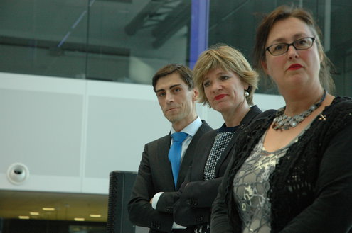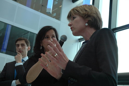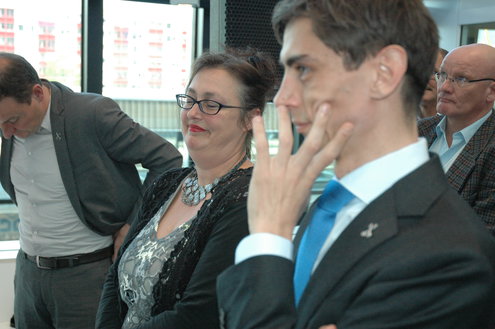 Majella de Spaey laat de ondernemers kennis maken met het stadsbestuur. hier met de nieuwe wethouders Laudy en Damen. (Foto's: Chris de Waard).
